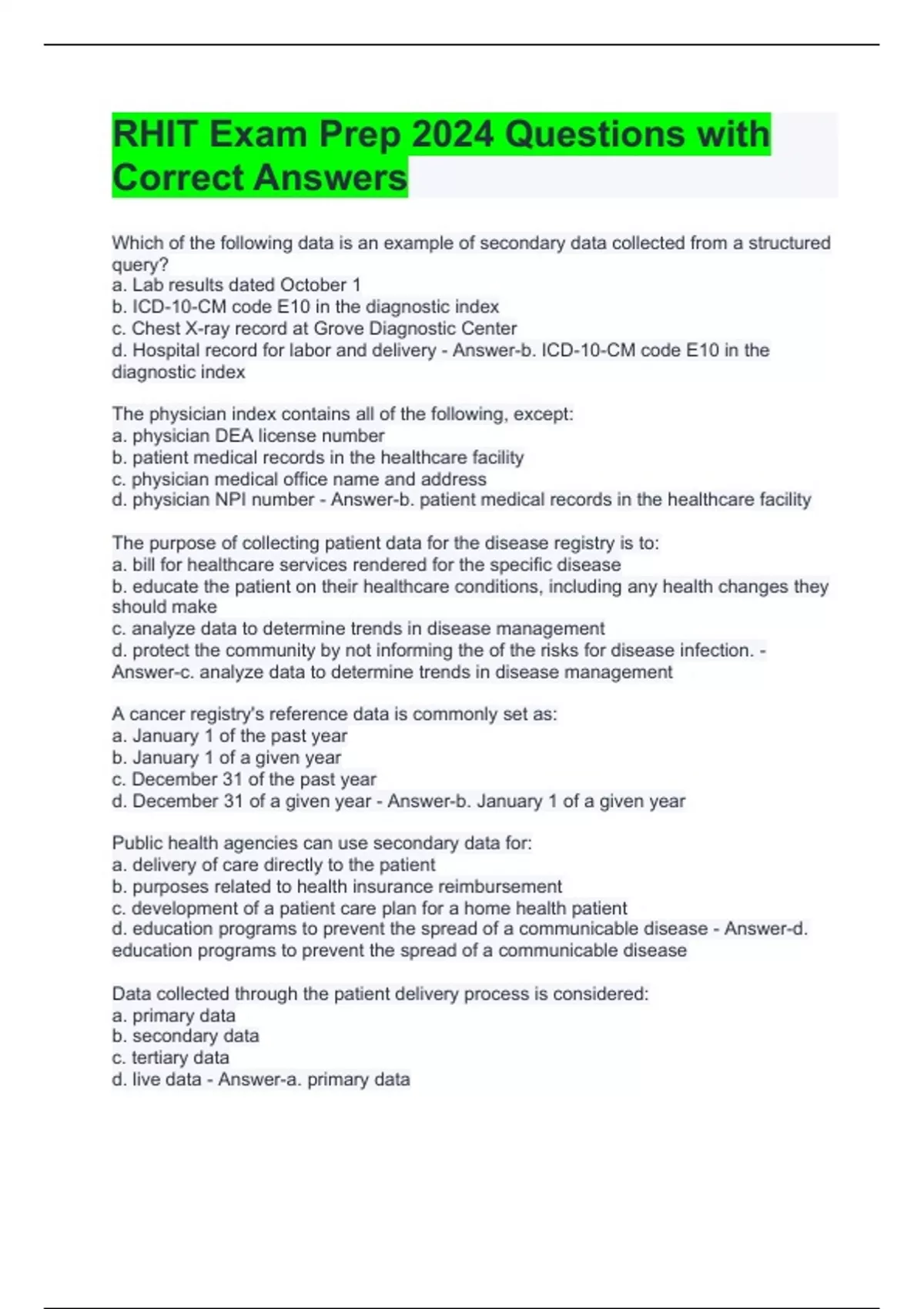 RHIT Exam Prep 2024 Questions with Correct Answers The certification standards for Certified Tumor Registrar (CTR) are establish by: a. medicare provider analysis and review b. national practitioner data bank c. national cancer registrars association d. The joint commission - Answer-c. national cancer registrars association The national center for Health Statistics collects data on the incidences of which of the following? a. Deaths and herpes b. divorce and viral meningitis c. fetal death and cancer d. deaths and divorce - Answer-d. deaths and divorce The Master Patient Index (MPI) is considered primary patient data because it reports: a. diagnostic data b. procedural data c. patient demographic data d. place of service data - Answer-c. patient demographic data All the following databases are used for clinical secondary research purposes EXCEPT: a. NPDB b. UMLS c. clinical trials database d. MEDLINE - Answer-a. NPDB San Antonio Hospital reported three colonoscopy patients who were diagnosed with a postoperative infection within 48 hours. In order to investigate the delivery of care, which facility-based index can be used to identify the provider who performed the procedure? a. disease index b. physician index c. disease registry d. physician registry - Answer-b. physician index Which of the following collection tools manages primary data? a. cancer registry b. trauma registry c. vital statistics d. computerized order entry - Answer-d. computerized order entry A large number of multiple births were occurring in communities that received their drinking water from the Rio Grande. After sampling the water, it was clear there was a correlation between the water and the multiple births. What other secondary uses could this data be used for? a. For patient caregiver support b. To deliver quality care to the patient