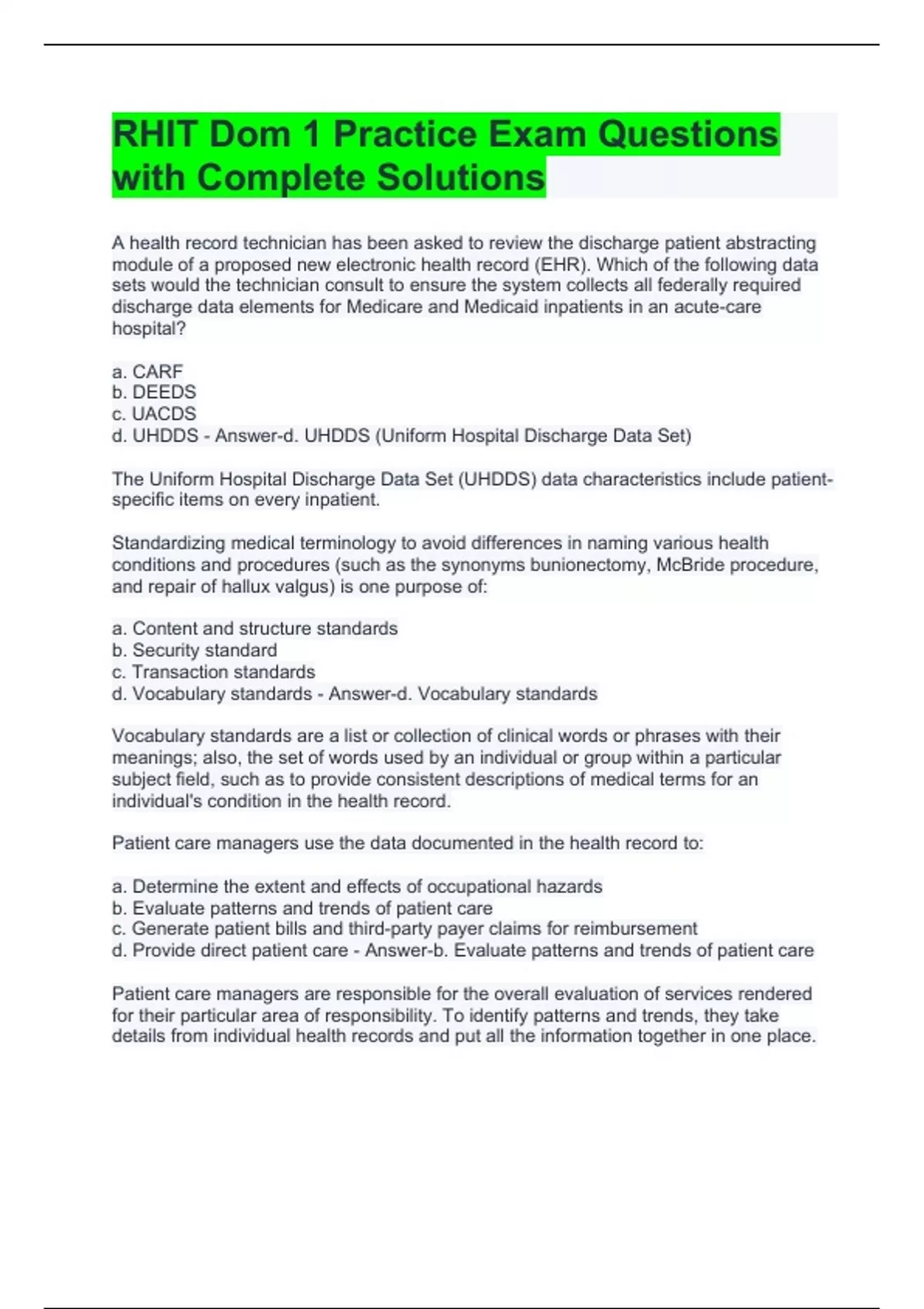 RHIT Dom 1 Practice Exam Questions with Complete Solutions A new health information management (HIM) director has been asked by the hospital CIO to ensure data content standards are identified, understood, implemented, and managed for the hospital's EHR system. Which of the following should be the HIM director's first step in carrying out this responsibility? a. Call the EHR vendor and ask to review the system's data dictionary b. Identify data content requirements for all areas of the organization c. Schedule a meeting with all department directors to get their input d. Contact CMS to determine what data sets are required to be collected - Answer-b. Identify data content requirements for all areas of the organization Data content standards allow organizations to collect data once and use it many times in many ways. They also assist in data storage and mining as well as sharing data with external organizations for use in benchmarking and other purposes. A health data analyst has been asked to compile a report of the percentage of patients who had a baseline partial thromboplastin time (PTT) test performed prior to receiving heparin. What clinical reports in the health record would the health data analyst need to consult in order to prepare this report? a. Physician progress notes and medication record b. Nursing and physician progress notes c. Medication administration record and clinical laboratory reports d. Physician orders and clinical laboratory reports - Answer-c. Medication administration record and clinical laboratory reports Clinical laboratory reports should be reviewed to determine if a partial thromboplastin time (PTT) test was performed. Medication Administration Records (MAR) should be reviewed to determine if heparin was given after the PTT test was performed. Which of the following is considered the authoritative resource in locating a health record? a. Disease index b. Master patient index c. Patient directory d. Patient registry - Answer-b. Master patient index (MPI) The master patient index (MPI) is the permanent record of all patients treated at a healthcare facility. It is used by the HIM department to look up patient demographics, dates of care, the patient's health record number, and other information. The HIM manager is conducting a study in which she is comparing the current year's diagnosis codes to the proposed new codes for the next fiscal year and documenting variations in order to assess the impact on the organization. This process creates a: a. Data chargemaster report b. Data dictionary c. Database management system d. Data map - Answer-d. Data map