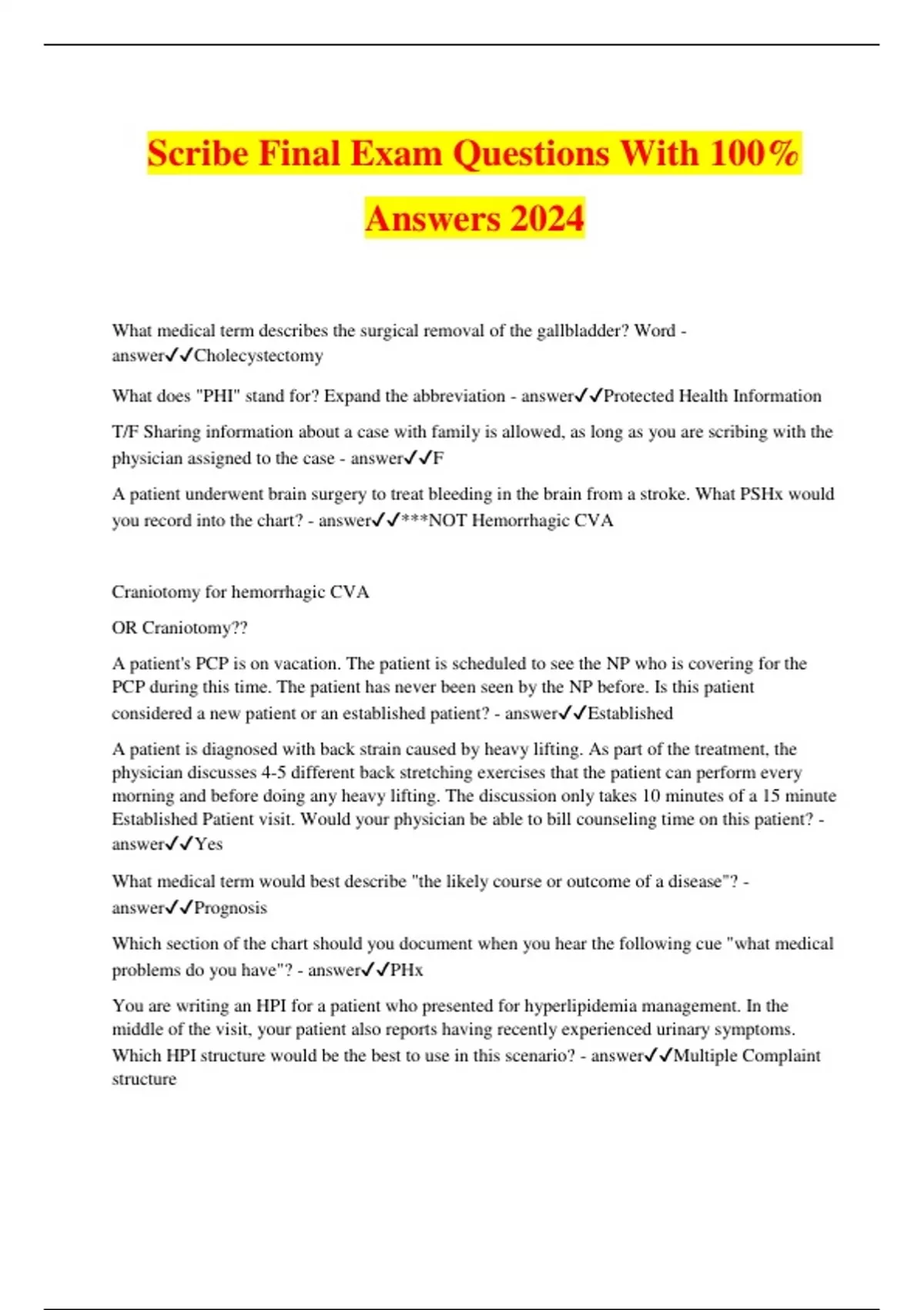 Scribe Final Exam Questions With 100% Answers 2024 What medical term describes the surgical removal of the gallbladder? Word - answerCholecystectomy What does "PHI" stand for? Expand the abbreviation - answerProtected Health Information T/F Sharing information about a case with family is allowed, as long as you are scribing with the physician assigned to the case - answerF A patient underwent brain surgery to treat bleeding in the brain from a stroke. What PSHx would you record into the chart? - answer***NOT Hemorrhagic CVA Craniotomy for hemorrhagic CVA OR Craniotomy?? A patient's PCP is on vacation. The patient is scheduled to see the NP who is covering for the PCP during this time. The patient has never been seen by the NP before. Is this patient considered a new patient or an established patient? - answerEstablished A patient is diagnosed with back strain caused by heavy lifting. As part of the treatment, the physician discusses 4-5 different back stretching exercises that the patient can perform every morning and before doing any heavy lifting. The discussion only takes 10 minutes of a 15 minute Established Patient visit. Would your physician be able to bill counseling time on this patient? - answerYes What medical term would best describe "the likely course or outcome of a disease"? - answerPrognosis Which section of the chart should you document when you hear the following cue "what medical problems do you have"? - answerPHx You are writing an HPI for a patient who presented for hyperlipidemia management. In the middle of the visit, your patient also reports having recently experienced urinary symptoms. Which HPI structure would be the best to use in this scenario? - answerMultiple Complaint structure Which of the following is NOT a purpose of HITECH? - answerTo require government accountability on health insurance plans available in the market place To require equal access, opportunity, and affordability for health insurance plans by screening patient health information To require patient accountability in paying for their health care visit What medical term would describe a patient with a history of infection or inflammation of the liver? - answerHepatitis For correct billing and reimbursement to go through, a counseling note requires documentation of the following: - answerTotal time with the patient Percentage of the time spent counseling You are writing an HPI for a very complex patient who has had multiple recent hospital admissions for lung cancer. Which HPI structure would be the best to use in this scenario? - answerChronologic Structure Which of the following would be valid complications for CAD? - answerMI Read the following HPI and verify whether this HPI meets Level 4 billing criteria for a NEW patient: 57 year old male patient presented with RLQ abdominal pain, which began 5 days ago. He states that he was mowing the lawn when the pain began. Patient reports he took OTC Tylenol yesterday without relief. There has been no nausea, vomiting or diarrhea. - answerYes, the HPI meets Level 4 billing criteria What are the possible consequences of a HIPAA violation? - answerLawsuit against you and the hospital Monetary fines to you and the hospital Scribe program cancellation Termination Prison time Violator is blacklisted from medical programs like Medical, PA, or NP school What does HIPAA stand for? Expand the abbreviation. - answerHealth Insurance Portability & Accountability Act What chronic condition would require diagnosis through fasting blood glucose level or HbA1c? - answerDiabetes Mellitus