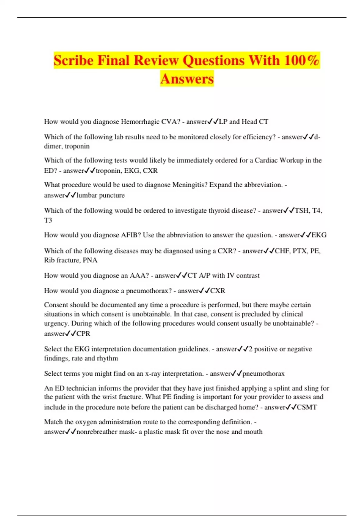 Scribe Final Review Questions With 100% Answers How would you diagnose Hemorrhagic CVA? - answerLP and Head CT Which of the following lab results need to be monitored closely for efficiency? - answerd- dimer, troponin Which of the following tests would likely be immediately ordered for a Cardiac Workup in the ED? - answertroponin, EKG, CXR What procedure would be used to diagnose Meningitis? Expand the abbreviation. - answerlumbar puncture Which of the following would be ordered to investigate thyroid disease? - answerTSH, T4, T3 How would you diagnose AFIB? Use the abbreviation to answer the question. - answerEKG Which of the following diseases may be diagnosed using a CXR? - answerCHF, PTX, PE, Rib fracture, PNA How would you diagnose an AAA? - answerCT A/P with IV contrast How would you diagnose a pneumothorax? - answerCXR Consent should be documented any time a procedure is performed, but there maybe certain situations in which consent is unobtainable. In that case, consent is precluded by clinical urgency. During which of the following procedures would consent usually be unobtainable? - answerCPR Select the EKG interpretation documentation guidelines. - answer2 positive or negative findings, rate and rhythm Select terms you might find on an x-ray interpretation. - answerpneumothorax An ED technician informs the provider that they have just finished applying a splint and sling for the patient with the wrist fracture. What PE finding is important for your provider to assess and include in the procedure note before the patient can be discharged home? - answerCSMT Match the oxygen administration route to the corresponding definition. - answernonrebreather mask- a plastic mask fit over the nose and mouth RA- this means the patient is not on oxygen NC- a plastic tube placed into the patient's nostrils BVM- a large facial mask held in place by hand and attached to an Ambu-bag used to manually inflate the patient's lungs Intubation- an EET goes through the patient's mouth and down the trachea FM- a facial mask with a reservoir bag attached A 13 y/o male patient was riding his bike earlier today and accidentally fell off after traveling on an uneven patch of sidewalk. He landed onto his outstretched right hand and subsequently experienced localized pain and swelling to the his right wrist. An x-ray of the right wrist shows a distal radial fracture. Now that the results are back, the physician will be ready to discharge the patient home. Which of the following would need to go into this patient's disposition note? - answerF/U with specialist or PCP, Specific conditions for return to the ED, Condition at time of disposition, Time period for f/u, Timing of disposition, patient mental capacity What abbreviation describes the scenario in which a patient declines a hospital stay and decides to go home instead? - answerAMA Which of the following would need to go into a consult note for a patient that will be admitted to the hospital for treatment of bacterial meningitis? - answerlocation in the hospital, name of the accepting facility, consultation note, condition at time of admission, name of accepting physician, specific conditions for return to the ED, What term describes "the patient destination is home"? - answerdischarge LBBB - answerLeft bundle branch block CVA - answercostovertebral angle Match each critical care dx with its associated procedure. - answercardiac rest- CPR sepsis- central line placement respiratory failure- Intubation acute exacerbation- CPAP/BiPAP abnormal herat rhythm- Cardioversion PTX- Chest tube Which of these procedures qualify as critical care procedures and would indicate that critical care time must be documented on a patient? - answerCardioversion, Central line placement, CPAP/BiPAP, chest tube, CPR, intubation Among the following diseases listed, select the ones that qualify for CCT - answerACS, CVA, Afib, acute MI, DKA, PTX, PE, sepsis NOT pleuritis, stable angina, or costochondritis What condition correctly describes "fertilized egg develops outside the uterus? - answerectopic pregnancy A patient recently went on a boat trip 2 days ago and developed dizziness which has continued to persist since onset. She describes her dizziness as a room spinning and reports that it is accompanied by tinnitus, nausea, and vomiting. Physical exam is positive for Romberg's and Head CT is negative. Based on this information which is the most likely final diagnosis for the patient? - answerBPV Which of the following are not valid DDx for a patient with CC of HA? - answersyncope, vertigo, Bell's palsy Match the following Dx with it's patient presentation - answerCHF- SOB+wheezing on exam+Shx of 3 ppd Asthma- SOB +wheezing on exam PE- SOB _ unilateral pedal edema +pleuritic CP COPD- SOB+bilateral pedal edema+CP What condition correctly describes "A vascular change that temporarily deprives a part of the brain of oxygen but does not result in any long lasting deficits"? - answerTIA Certain words or phrases act as "red flags" to grab your provider's attention to let let them know that a patient may require timely and comprehensive medical action. Which of the following words or phrases are NOT considered a "red flag?" - answerchest pain in a 45 year old female, tearing pain in the central chest going straight through to the back in a 40 year old female Which section of the chart would you find AKA? - answerPMHx, PSHx, PE Which of the following would be documented in ED Course? - answerre-evals, disposition What FHx/SHx information is usually asked for pediatric patients? (Select all that apply.) - answerimmunization status, second hand smoke exposure A 45 year old male presents to the ED with a ripping, tearing pain to his central chest radiating straight to his back with associated nausea that began 1 hour ago. What emergency conditions (ideally from what you have learned in CRT) from the following list may explain the patient's symptoms? - answerAAA, aortic dissection, and MI What R