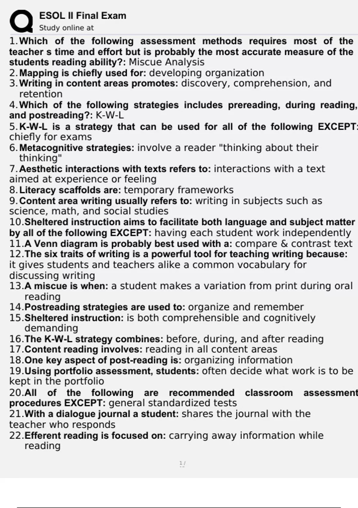 ESOL II Final Exam Actual Questions and Answers New Version 2024 with complete solution