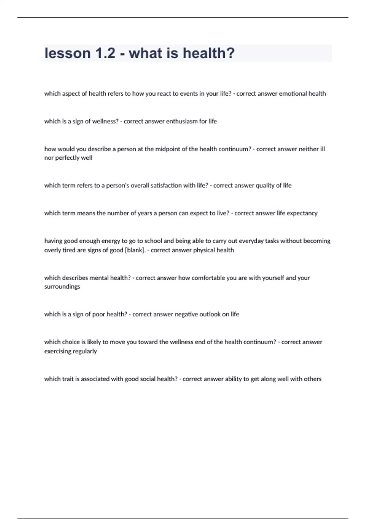 Lesson 1.2 - What Is Health Final Test Guide 2024.