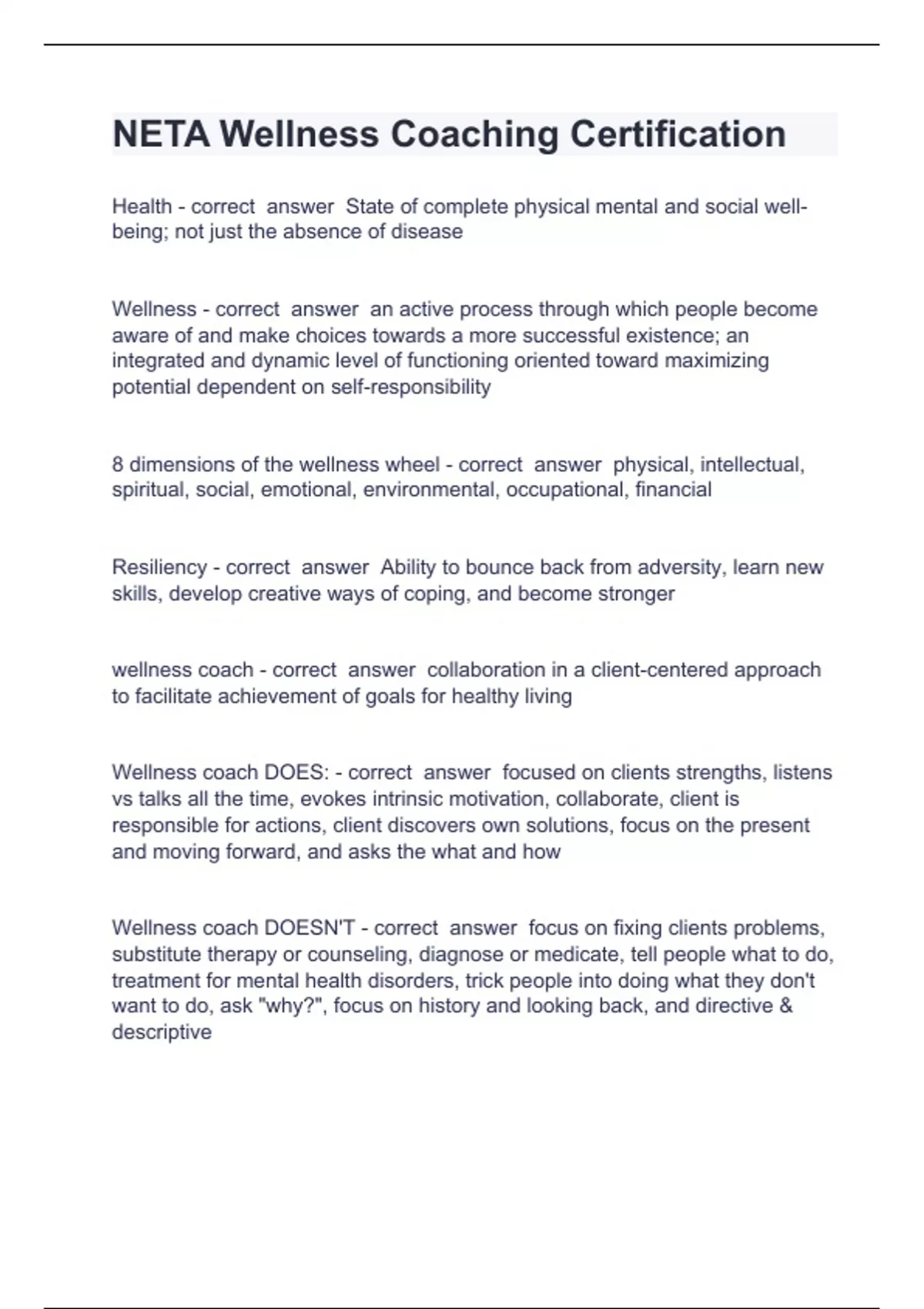 NETA Wellness Coaching Certification Question and answers rated A+ 2024 Health - correct answer State of complete physical mental and social well-being; not just the absence of disease Wellness - correct answer an active process through which people become aware of and make choices towards a more successful existence; an integrated and dynamic level of functioning oriented toward maximizing potential dependent on self-responsibility 8 dimensions of the wellness wheel - correct answer physical, intellectual, spiritual, social, emotional, environmental, occupational, financial Resiliency - correct answer Ability to bounce back from adversity, learn new skills, develop creative ways of coping, and become stronger wellness coach - correct answer collaboration in a client-centered approach to facilitate achievement of goals for healthy living