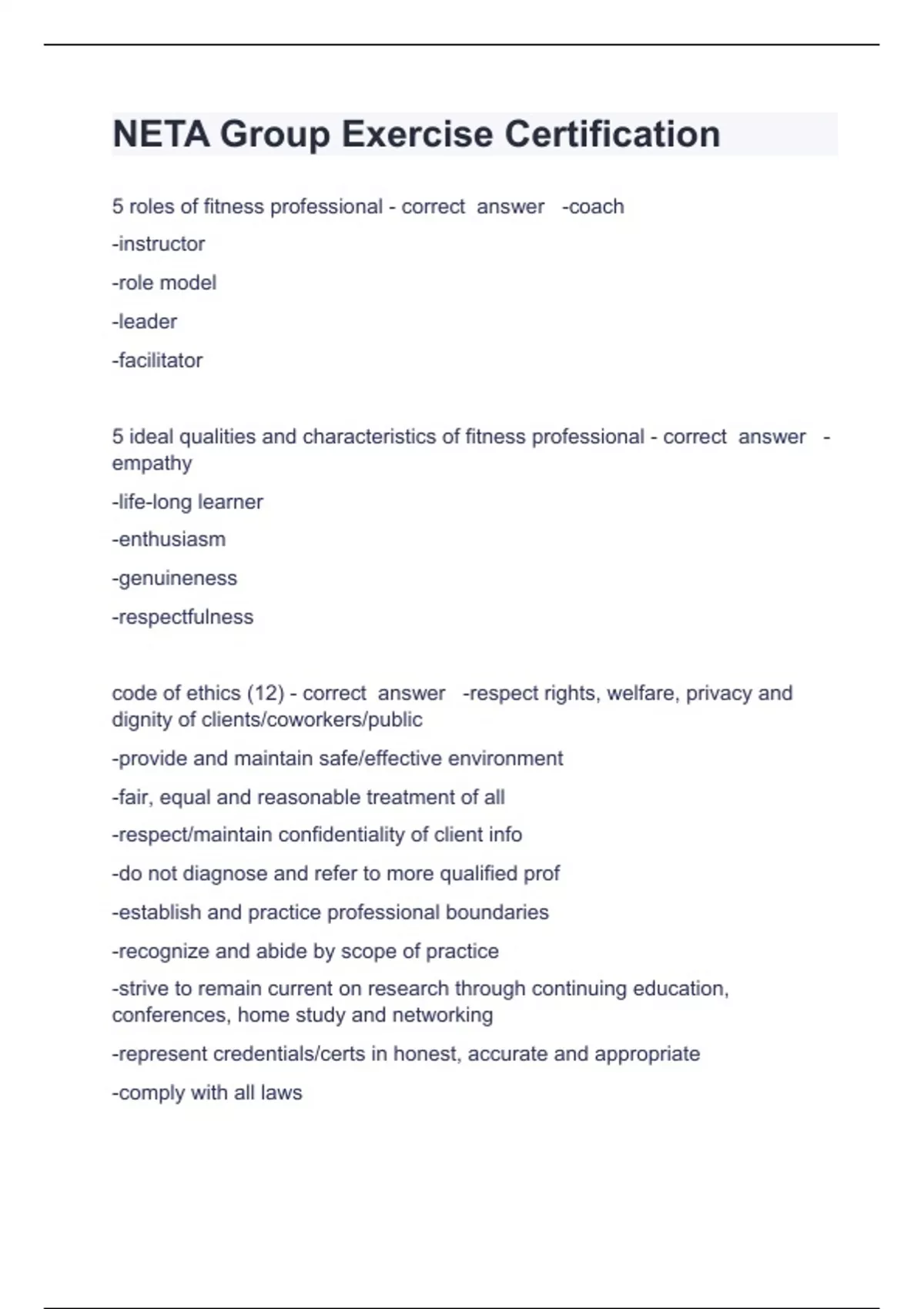 NETA Group Exercise Certification Question and answers already passed 2024 5 roles of fitness professional - correct answer -coach -instructor -role model -leader -facilitator 5 ideal qualities and characteristics of fitness professional - correct answer -empathy -life-long learner -enthusiasm -genuineness -respectfulness code of ethics (12) - correct answer -respect rights, welfare, privacy and dignity of clients/coworkers/public -provide and maintain safe/effective environment -fair, equal and reasonable treatment of all -respect/maintain confidentiality of client info -do not diagnose and refer to more qualified prof -establish and practice professional boundaries -recognize and abide by scope of practice -strive to remain current on research through continuing education, conferences, hom