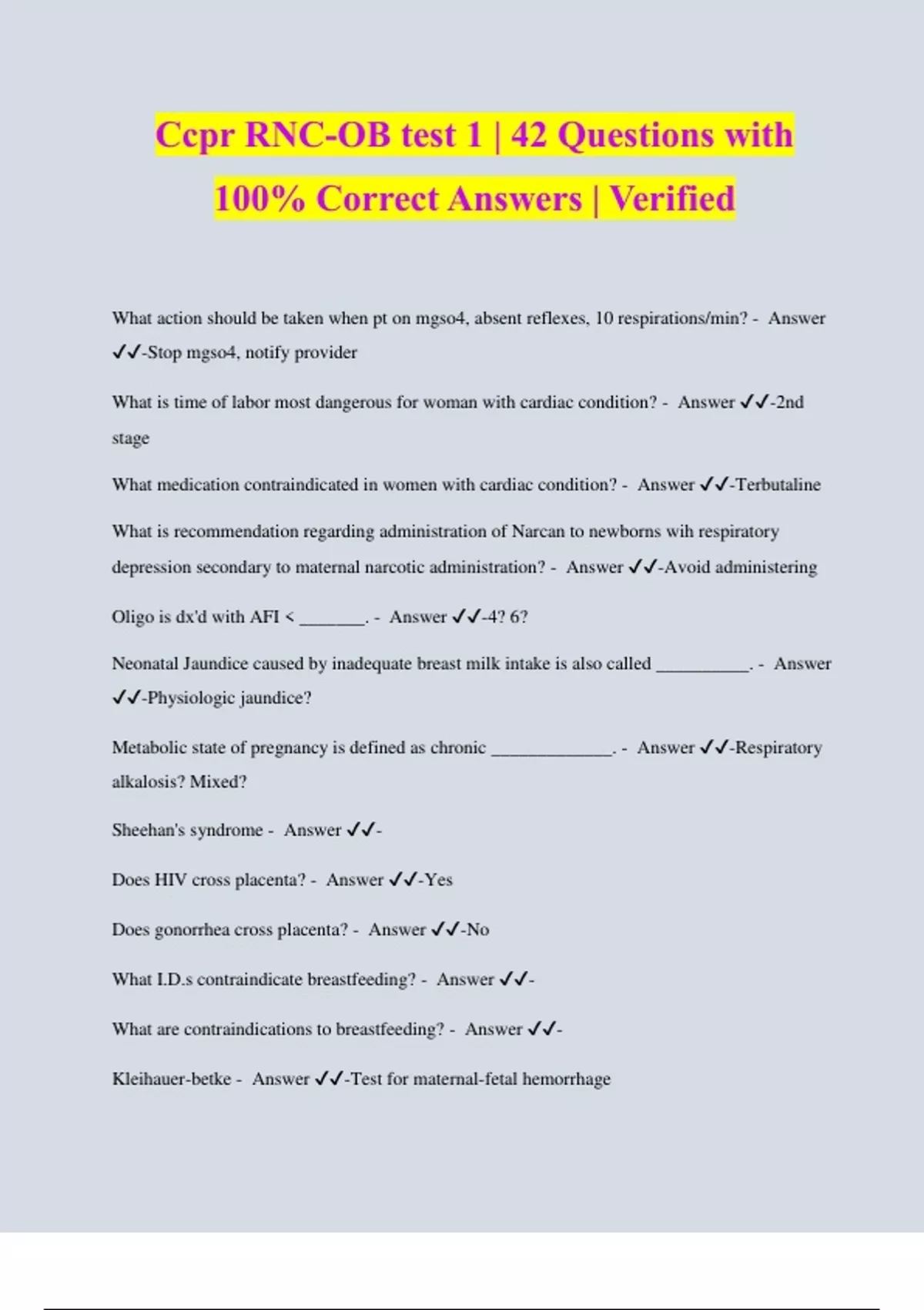 Ccpr RNC-OB test 1 | 42 Questions with 100% Correct Answers | Verified What action should be taken when pt on mgso4, absent reflexes, 10 respirations/min? - Answer ️️ -Stop mgso4, notify provider What is time of labor most dangerous for woman with cardiac condition? - Answer ️️ -2nd stage What medication contraindicated in women with cardiac condition? - Answer ️️ -Terbutaline What is recommendation regarding administration of Narcan to newborns wih respiratory depression secondary to maternal narcotic administration? - Answer ️️ -Avoid administering Oligo is dx'd with AFI _______. - Answer ️️ -4? 6? Neonatal Jaundice caused by inadequate breast milk intake is also called __________. - Answer ️️ -Physiologic jaundice? Metabolic state of pregnancy is defined as chronic _____________. - Answer ️️ -Respiratory alkalosis? Mixed? Sheehan's syndrome - Answer ️️ - Does HIV cross placenta? - Answer ️️ -Yes Does gonorrhea cross placenta? - Answer ️️ -No What I.D.s contraindicate breastfeeding? - Answer ️️ - What are contraindications to breastfeeding? - Answer ️️ - Kleihauer-betke - Answer ️️ -Test for maternal-fetal hemorrhage