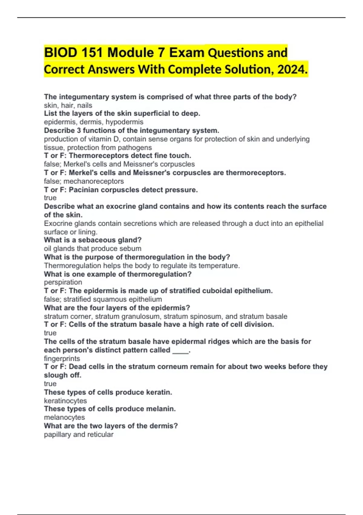 BIOD 151 Module 7 Exam Questions and Correct Answers With Complete Solution, 2024. The integumentary system is comprised of what three parts of the body? skin, hair, nails List the layers of the skin superficial to deep. epidermis, dermis, hypodermis Describe 3 functions of the integumentary system. production of vitamin D, contain sense organs for protection of skin and underlying tissue, protection from pathogens T or F: Thermoreceptors detect fine touch. false; Merkel's cells and Meissner's corpuscles T or F: Merkel's cells and Meissner's corpuscles are thermoreceptors. false; mechanoreceptors T or F: Pacinian corpuscles detect pressure. true Describe what an exocrine gland contains and how its contents reach the surface of the skin. Exocrine glands contain secretions which are released through a duct into an epithelial surface or lining. What is a sebaceous gland? oil glands that produce sebum What is the purpose of thermoregulation in the body? Thermoregulation helps the body to regulate its temperature. What is one example of thermoregulation? perspiration T or F: The epidermis is made up of stratified cuboidal epithelium. false; stratified squamous epithelium What are the four layers of the epidermis? stratum corner, stratum granulosum, stratum spinosum, and stratum basale T or F: Cells of the stratum basale have a high rate of cell division. true The cells of the stratum basale have epidermal ridges which are the basis for each person's distinct pattern called ____. fingerprints T or F: Dead cells in the stratum corneum remain for about two weeks before they slough off. true These types of cells produce keratin. keratinocytes These types of cells produce melanin. melanocytes What are the two layers of the dermis? papillary and reticular Which layer of the dermis contains the main blood supply for the skin? reticular region What is the medical term for a bruise? contusion What is one of the purposes of the hypodermis? Fat helps to insulate and regulate body temperature. What is a dermatome? region of skin innervation by one sensory nerve Where is the information gathered from a dermatome sent? The sensory information gathered in each region of the skin is sent to the spinal cord and then finally the brain for processing. T or F: The root of the hair follicle begins at the shaft. false; hair bulb Each hair follicle is connected to a muscle called ____. arrector pili muscle T or F: Hair can be impacted by hormones circulating the body. true T or F: Nails are comprised of live skin cells. false; dead Is the nail body the visible or invisible portion of the nail? visible What types of cells form a blood clot? platelets Mast cells release what type of chemical? histamine What is the purpose of histamine? helps to dilate blood vessels to bring increased blood and nutrients to the injured area T or F: Fibroblasts are involved in engulfing foreign bacteria and particles. false; macrophages Fibroblasts secrete what substance to assist in wound healing? collagen What is the final phase of wound healing? remodeling What type of burn damages only the epidermis? first degree burn Your patient was involved in a severe cooking accident. She is not able to feel any sensation in the burned area. What type of burn did your patient incur? fourth degree burn What do nociceptors respond to? pain What do thermoreceptors respond to? changes in temperature What do melanocytes produce? melanin What are Langerhans cells?