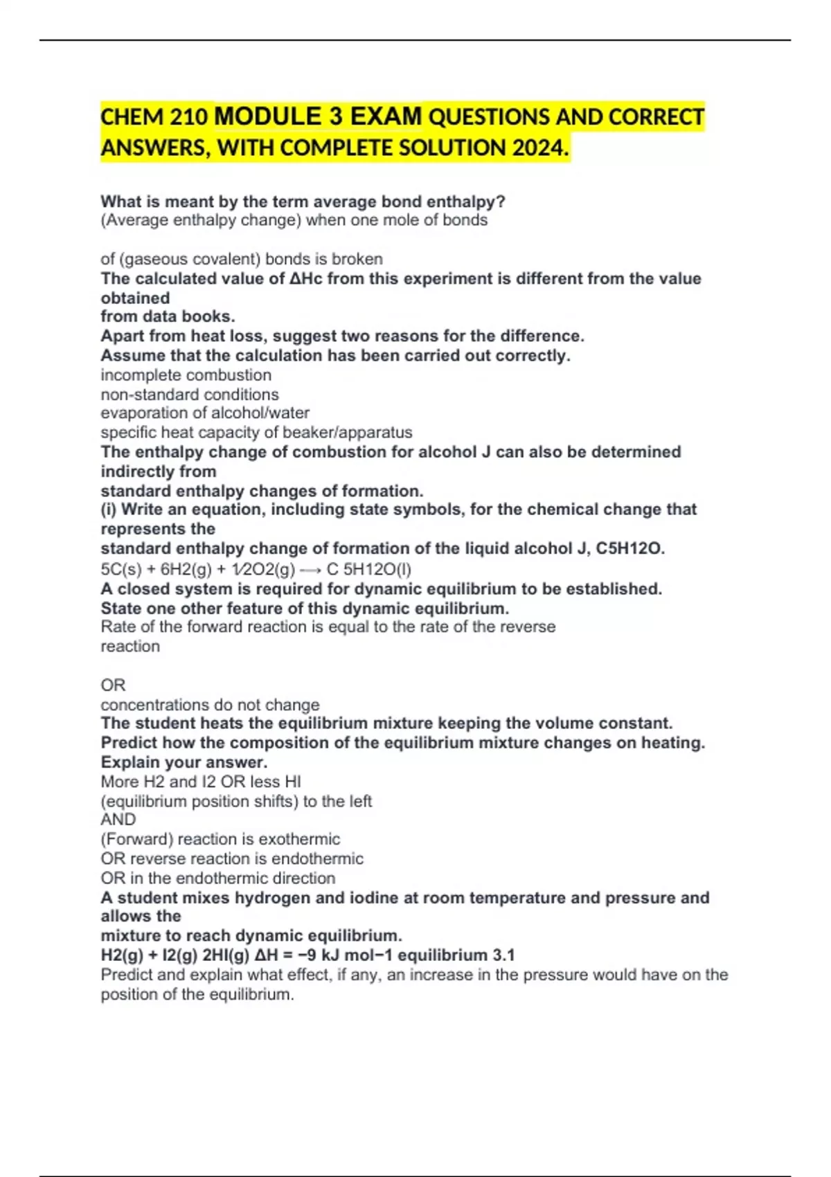 CHEM 210 MODULE 3 EXAM QUESTIONS AND CORRECT ANSWERS, WITH COMPLETE SOLUTION 2024. What is meant by the term average bond enthalpy? (Average enthalpy change) when one mole of bonds of (gaseous covalent) bonds is broken The calculated value of ΔHc from this experiment is different from the value obtained from data books. Apart from heat loss, suggest two reasons for the difference. Assume that the calculation has been carried out correctly. incomplete combustion non-standard conditions evaporation of alcohol/water specific heat capacity of beaker/apparatus The enthalpy change of combustion for alcohol J can also be determined indirectly from standard enthalpy changes of formation. (i) Write an equation, including state symbols, for the chemical change that represents the standard enthalpy change of formation of the liquid alcohol J, C5H12O. 5C(s) + 6H2(g) + 1⁄2O2(g) ⎯→ C 5H12O(l) A closed system is required for dynamic equilibrium to be established. State one other feature of this dynamic equilibrium. Rate of the forward reaction is equal to the rate of the reverse reaction OR concentrations do not change The student heats the equilibrium mixture keeping the volume constant. Predict how the composition of the equilibrium mixture changes on heating. Explain your answer. More H2 and I2 OR less HI (equilibrium position shifts) to the left AND (Forward) reaction is exothermic OR reverse reaction is endothermic OR in the endothermic direction A student mixes hydrogen and iodine at room temperature and pressure and allows the mixture to reach dynamic equilibrium. H2(g) + I2(g) 2HI(g) ΔH = −9 kJ mol−1 equilibrium 3.1 Predict and explain what effect, if any, an increase in the pressure would have on the position of the equilibrium. effect .................................................................................................................................. explanation ............................................................ No effect AND Same number of (gaseous) moles on both sides ............................................................ What is meant by the term standard enthalpy change of formation? Give the standard conditions. (Enthalpy change) when one mole of a compound is formed from its elements 298 K / 25 °C AND 1 atm / 100 kPa / 101 kPa / 1 bar Describe and explain, using equations, how the concentration of ozone in the stratosphere is maintained. O3 O2 + O AND O + O2 O3 rate of ozone decomposition (almost) equals rate of ozone formation In the stratosphere, NO catalyses the breakdown of ozone. Write two equations to show how NO catalyses this breakdown. NO + O.3 NO2 + O2 NO2 + O NO + O2 It is not possible to measure the enthalpy change of formation of N2O(g) directly. Suggest why it is not possible. It is very difficult to determine the standard enthalpy change of formation of hexane directly. Suggest a reason why. Reaction gives NO OR reaction gives NO2 OR reaction gives a mixture of oxides OR activation energy too high OR rate of reaction is too slow Methane is a greenhouse gas. Scientists are concerned that the concentration of methane in the atmosphere is slowly increasing. (i) Explain how atmospheric methane molecules can contribute to global warming. Absorbs IR radiation Bonds vibrate One way that scientists hope to minimise global warming is by developing Carbon Capture and Storage, CCS, techniques. Describe two of these CCS techniques. (liquid) injected deep into the oceans