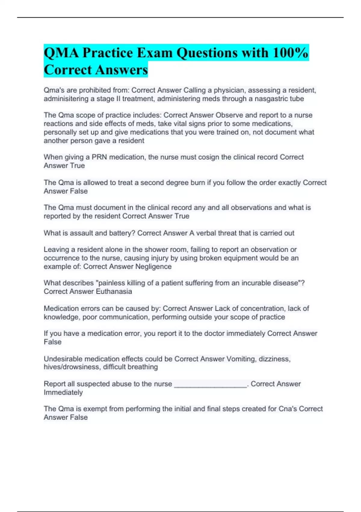Qma's are prohibited from: Correct Answer Calling a physician, assessing a resident, adminisitering a stage II treatment, administering meds through a nasgastric tube The Qma scope of practice includes: Correct Answer Observe and report to a nurse reactions and side effects of meds, take vital signs prior to some medications, personally set up and give medications that you were trained on, not document what another person gave a resident When giving a PRN medication, the nurse must cosign the clinical record Correct Answer True The Qma is allowed to treat a second degree burn if you follow the order exactly Correct Answer False The Qma must document in the clinical record any and all observations and what is reported by the resident Correct Answer True What is assault and battery? Correct Answer A verbal threat that is carried out Leaving a resident alone in the shower room, failing to report an observation or occurrence to the nurse, causing injury by using broken equipment would be an example of: Correct Answer Negligence What describes "painless killing of a patient suffering from an incurable disease"? Correct Answer Euthanasia Medication errors can be caused by: Correct Answer Lack of concentration, lack of knowledge, poor communication, performing outside your scope of practice If you have a medication error, you report it to the doctor immediately Correct Answer False Undesirable medication effects could be Correct Answer Vomiting, dizziness, hives/drowsiness, difficult breathing Report all suspected abuse to the nurse __________________. Correct Answer Immediately The Qma is exempt from performing the initial and final steps created for Cna's Correct Answer False