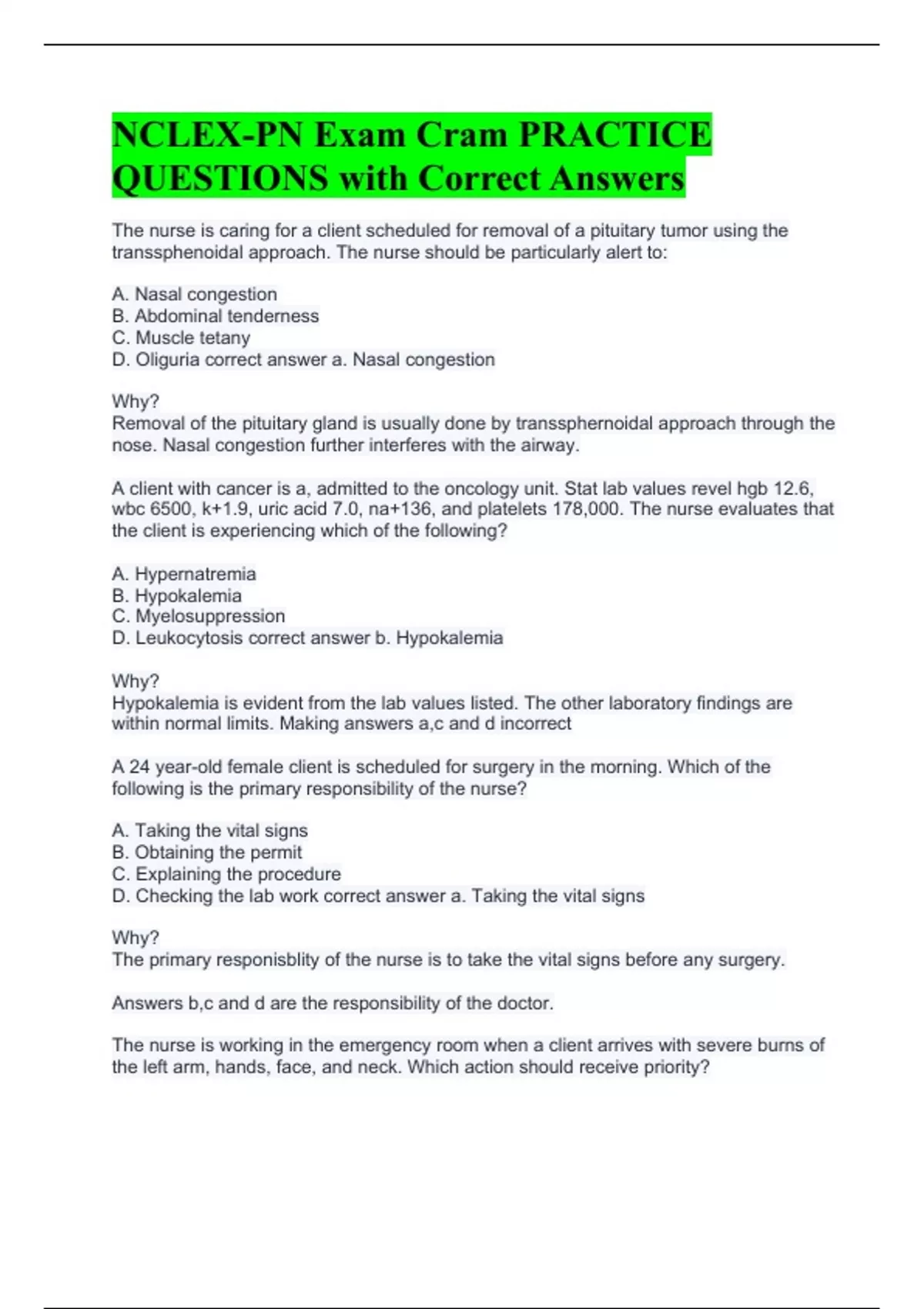 The nurse is caring for a client scheduled for removal of a pituitary tumor using the transsphenoidal approach. The nurse should be particularly alert to: A. Nasal congestion B. Abdominal tenderness C. Muscle tetany D. Oliguria correct answer a. Nasal congestion Why? Removal of the pituitary gland is usually done by transsphernoidal approach through the nose. Nasal congestion further interferes with the airway. A client with cancer is a, admitted to the oncology unit. Stat lab values revel hgb 12.6, wbc 6500, k+1.9, uric acid 7.0, na+136, and platelets 178,000. The nurse evaluates that the client is experiencing which of the following? A. Hypernatremia B. Hypokalemia C. Myelosuppression D. Leukocytosis correct answer b. Hypokalemia Why? Hypokalemia is evident from the lab values listed. The other laboratory findings are within normal limits. Making answers a,c and d incorrect A 24 year-old female client is scheduled for surgery in the morning. Which of the following is the primary responsibility of the nurse? A. Taking the vital signs B. Obtaining the permit C. Explaining the procedure D. Checking the lab work correct answer a. Taking the vital signs Why? The primary responisblity of the nurse is to take the vital signs before any surgery. Answers b,c and d are the responsibility of the doctor. The nurse is working in the emergency room when a client arrives with severe burns of the left arm, hands, face, and neck. Which action should receive priority? A. Starting an iv? B. Applying oxygen C.obtaining blood gas D. Medicating the client foe pain correct answer b. Applying oxygen Why? The client with burns to the neck needs airway assessments and supplemental oxygen, so applying oxygen is priority. The next action should be to start an iv and medicate for pain. The nurse is visiting a home health client with osteoporosis. The client has a new prescription for alendronate (fosamax). Which instructions should be given to the client A. Rest in bed after taking the medication for at least 30 mins B. Avoid rapid movements after taking the medication C. Take medication with water only D. Allow at least 1 hour between taking the medicine and taking other medications correct answer c. Take medication with water only Why? Fosmax should be taken with water only. The client should also remain upright for at least 30 mins after taking the medication. The nurse is making initial rounds on a client with a c5 fracture and crutchfield thongs. Which equipment should be kept at the bedside? A. A pair of forceps B. A torque wrench C. A pair or wire cutters D. A screwdriver correct answer b. A torque wrench Why? A tourque wrench is kept at the bedside to tighten and loosen the screws of crutchfield tongs. This wrench controls the amount of pressure that is placed on the screws. An infant weighs 7 pounds at birth. The excpectd weight by 1 year should be: A. 10 pounds B.12 pounds C. 18 pounds D. 21 pounds correct answer d. 21 pounds Why?