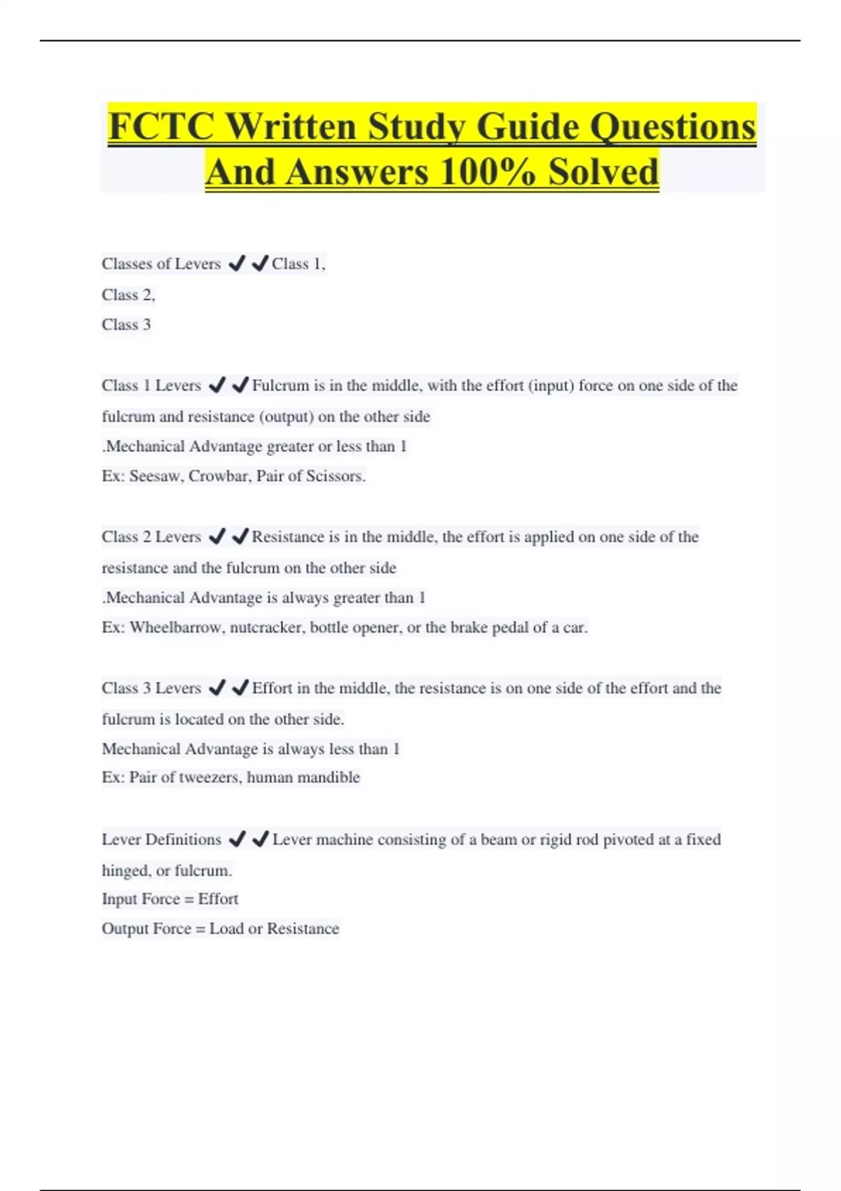 FCTC Written Study Guide Questions And Answers 100% Solved Classes of Levers ️️Class 1, Class 2, Class 3 Class 1 Levers ️️Fulcrum is in the middle, with the effort (input) force on one side of the fulcrum and resistance (output) on the other side .Mechanical Advantage greater or less than 1 Ex: Seesaw, Crowbar, Pair of Scissors. Class 2 Levers ️️Resistance is in the middle, the effort is applied on one side of the resistance and the fulcrum on the other side .Mechanical Advantage is always greater than 1 Ex: Wheelbarrow, nutcracker, bottle opener, or the brake pedal of a ca