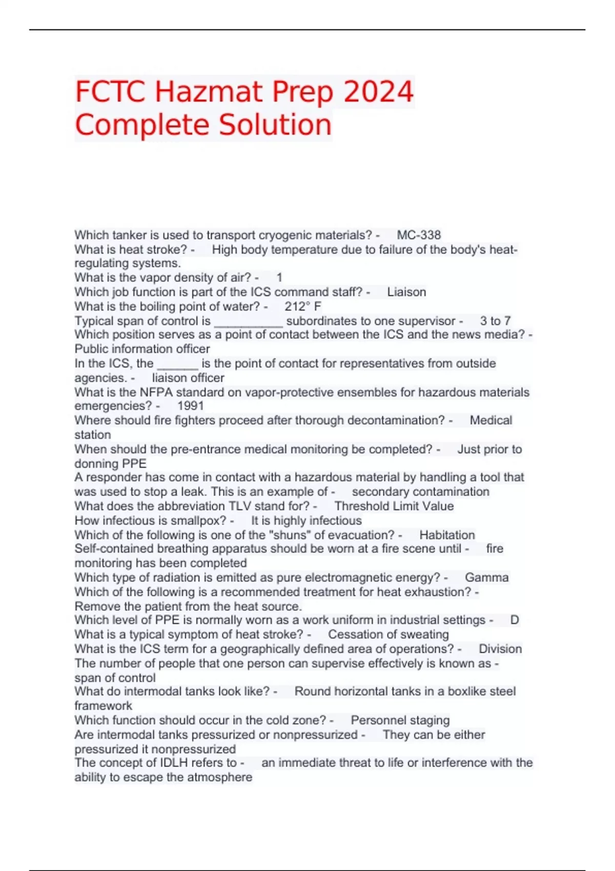 FCTC Hazmat Prep 2024 Complete Solution Which tanker is used to transport cryogenic materials? - MC-338 What is heat stroke? - High body temperature due to failure of the body's heat-regulating systems. What is the vapor density of air? - 1 Which job function is part of the ICS command staff? - Liaison What is the boiling point of water? - 212° F Typical span of control is __________ subordinates to one supervisor - 3 to 7 Which position serves as a point of contact between the ICS and the news media? - Public information officer In the ICS, the ______ is the point of contact for representatives from outside agencies. - liaison officer What is the NFPA standard on vapor-protective ensembles for hazardous materials emergencies? - 1991 Where should fire fighters proceed after thorough decontamination? - Medical station When should the pre-entrance medical monitoring be completed? - Just prior to donning PPE A responder has come in contact with a hazardous material by handling a tool that was used to stop a leak. This is an example of - secondary contamination What does the abbreviation TLV stand for? - Threshold Limit Value How infectious is smallpox? - It is highly infectious Which of the following is one of the "shuns" of evacuation? - Habitation Self-contained breathing apparatus should be worn at a fire scene until - fire monitoring has been completed
