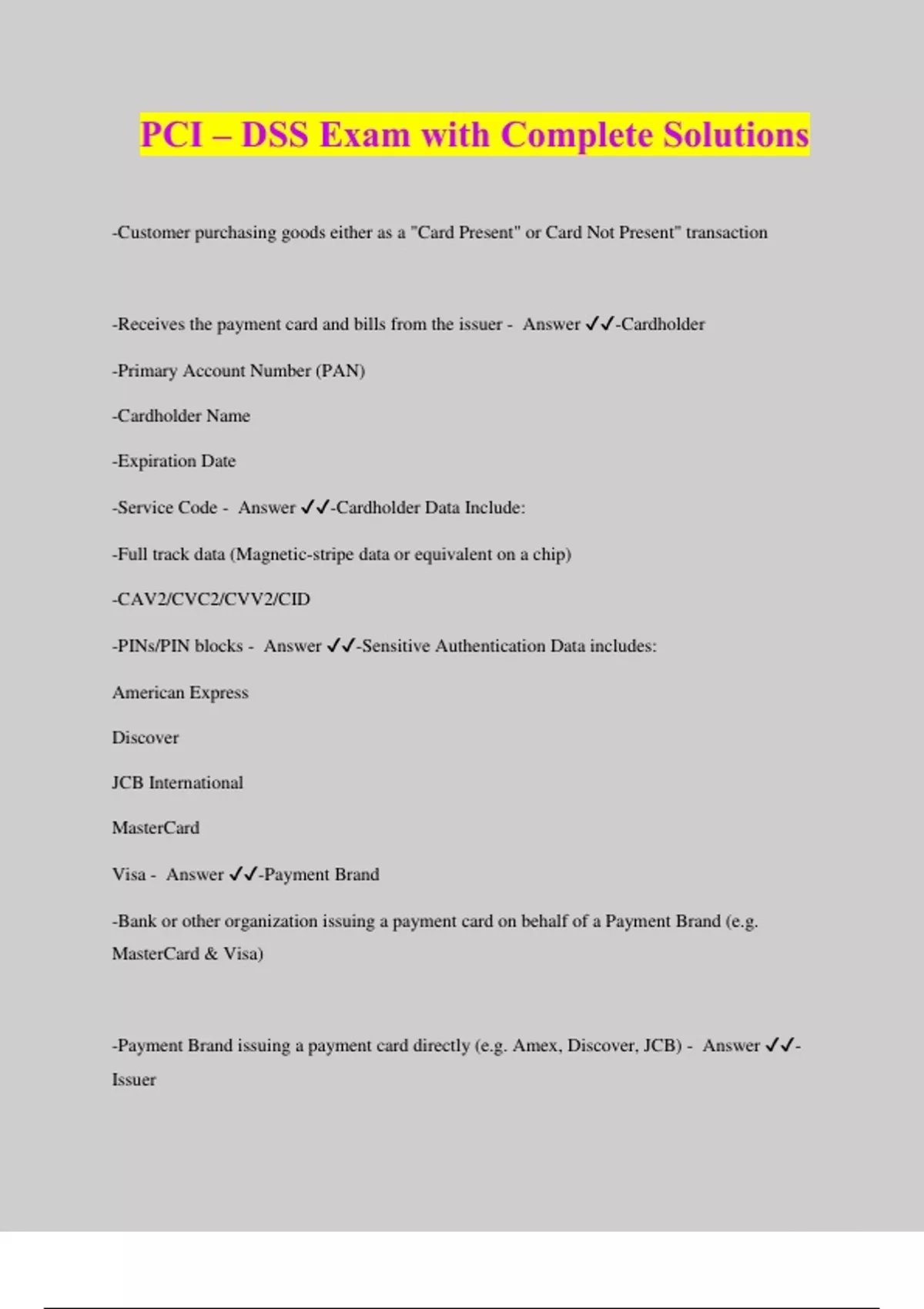 PCI – DSS Exam with Complete Solutions -Customer purchasing goods either as a "Card Present" or Card Not Present" transaction -Receives the payment card and bills from the issuer - Answer ️️ -Cardholder -Primary Account Number (PAN) -Cardholder Name -Expiration Date -Service Code - Answer ️️ -Cardholder Data Include: -Full track data (Magnetic-stripe data or equivalent on a chip) -CAV2/CVC2/CVV2/CID -PINs/PIN blocks - Answer ️️ -Sensitive Authentication Data includes: American Express Discover JCB International MasterCard Visa - Answer ️️ -Payment Brand -Bank or other organization issuing a payment card on behalf of a Payment Brand (e.g. MasterCard & Visa) -Payment Brand issuing a payment card directly (e.g. Amex, Discover, JCB) - Answer ️️ - Issuer Organization accepting the payment card for payment during a purchase - Answer ️️ - Merchant *Bank or entity the merchant uses to process their payment card transactions *Receive authorization request from merchant and forward to Issuer for approval *Provide authorization, clearing, and settlement services to merchants *Acquirer is also called --Merchant Bank --ISO --Payment Brand -Amex, Discover, JCB --Never Visa or MasterCard - Answer ️️ -Acquirer *Acquirer is responsible for merchant compliance --Know payment brand compliance programs and how they apply to merchants --Ensure that their merchants understand PCI DSS compliance requirements and track compliance efforts --Manage Merchant communications *work with merchants until compliance has been validated --Merchants are not compliant until all applicable requirements have been met and validated --Acquirer is responsible for providing merchant compliance status to payment brands *Incur any liability that may result from non-compliance with payment brand compliance programs - Answer ️️ -Common Acquirer Responsibilities *A service provider is a business that is not a payment brand, directly involved in the processing, storage, or transmission of cardholder data on behalf of another entity. -Sometimes a service provider is a merchant *Service Provider also includes companies that provide services (to merchants, service providers, or other entities), which control or could impact the security of cardholder data - Answer ️️ -Service Providers 1. Install and maintain a firewall configuration to protect cardholder data 2. Do not use vendor-supplied defaults for system passwords and other security parameters - Answer ️️ -Standard 1: Build and Maintain a Secure Network and Systems 3. Protect stored cardholder data 4. Encrypt transmission of cardholder data across open, public networks - Answer ️️ -Standard 2: Protect Cardholder Data 5. Protect all systems against malware and regularly update anti-virus software or programs 6. Develop and maintain secure systems and applications - Answer ️️ -Standard 3: Maintain a Vulnerability Management Program 7. Restrict access to cardholder data by business need to know 8. Identify and authenticate access to system components 9. Restrict physical access to cardholder data - Answer ️️ -Standard 4: Implement Strong Access Control Measures 10. Track and monitor all access to network resources and cardholder data 11. Regularly test security systems and processes - Answer ️️ -Standard 5: Regularly Monitor and Test Networks 12. Maintain a policy that addresses information security for all personnel - Answer ️️ - Standard 6: Maintain an Information Security Policy Install and maintain a firewall configuration to protect cardholder data - Answer ️️ - Requirement 1 Do not use vendor-supplied defaults for system passwords and other security parameters - Answer ️️ -Requirement 2 Protect stored cardholder data - Answer ️️ -Requirement 3 Encrypt transmission of cardholder data across open, public networks - Answer ️️ - Requirement 4 Protect all systems against malware and regularly update anti-virus software or programs - Answer ️️ -Requirement 5 Develop and maintain secure systems and applications - Answer ️️ -Requirement 6 Restrict access to cardholder data by business need to know - Answer ️️ -Requirement 7 Identify and authenticate access to system components - Answer ️️ -Requirement 8 Restrict physical access to cardholder data - Answer ️️ -Requirement 9 Track and monitor all access to network resources and cardholder data - Answer ️️ - Requirement