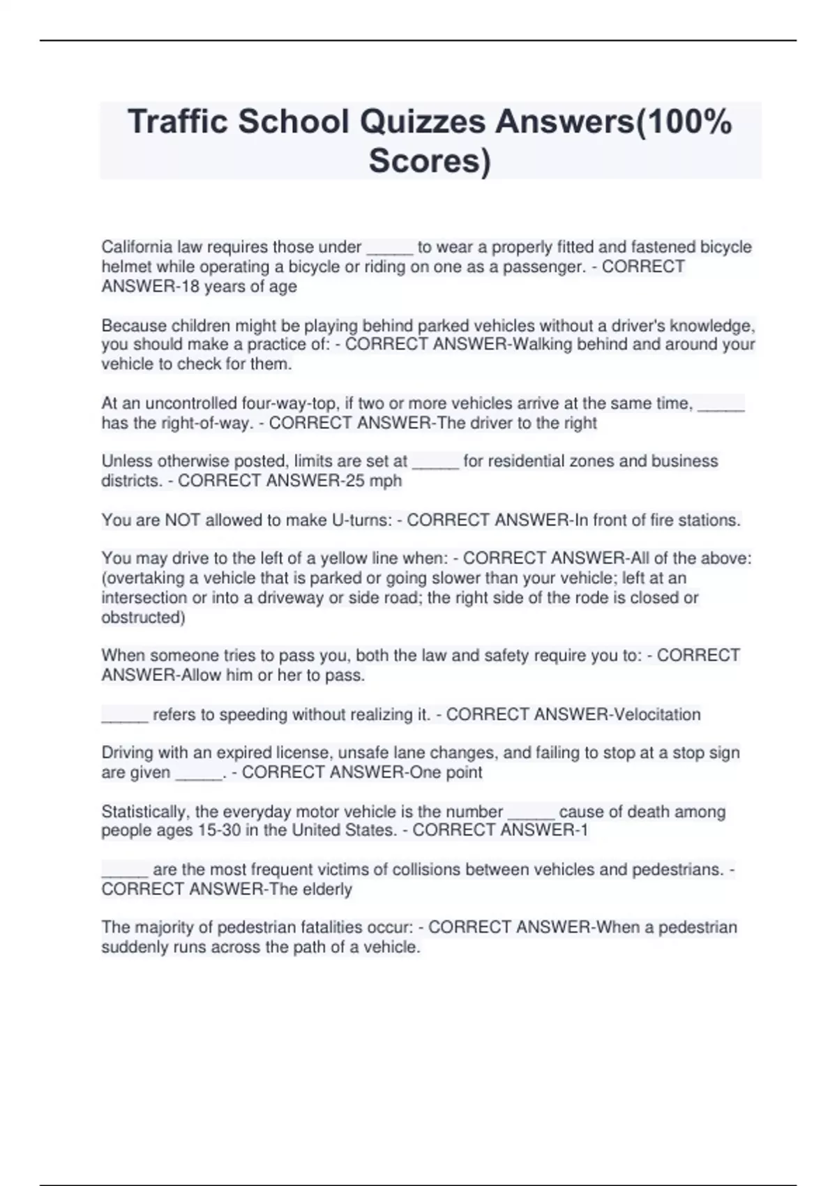 Traffic School Quizzes Answers(100% Scores) California law requires those under _____ to wear a properly fitted and fastened bicycle helmet while operating a bicycle or riding on one as a passenger. - CORRECT ANSWER-18 years of age Because children might be playing behind parked vehicles without a driver's knowledge, you should make a practice of: - CORRECT ANSWER-Walking behind and around your vehicle to check for them. At an uncontrolled four-way-top, if two or more vehicles arrive at the same time, _____ has the right-of-way. - CORRECT ANSWER-The driver to the right Unless otherwise posted, limits are set at _____ for residential zones and business districts. - CORRECT ANSWER-25 mph You are NOT allowed to make U-turns: - CORRECT ANSWER-In front of fire stations. You may drive to the left of a yellow line when: - CORRECT ANSWER-All of the above: (overtaking a vehicle that is parked or going slower than your vehicle; left at an intersection or into a driveway or side road; the right side of the rode is closed or obstructed) When someone tries to pass you, both the law and safety require you to: - CORRECT ANSWER-Allow him or her to pass. _____ refers to speeding without realizing it. - CORRECT ANSWER-Velocitation Driving with an expired license, unsafe lane changes, and failing to stop at a stop sign are given _____. - CORRECT ANSWER-One point Statistically, the everyday motor vehicle is the number _____ cause of death among people ages 15-30 in the United States. - CORRECT ANSWER-1 _____ are the most frequent victims of collisions between vehicles and pedestrians. - CORRECT ANSWER-The elderly The majority of pedestrian fatalities occur: - CORRECT ANSWER-When a pedestrian suddenly runs across the path of a vehicle.