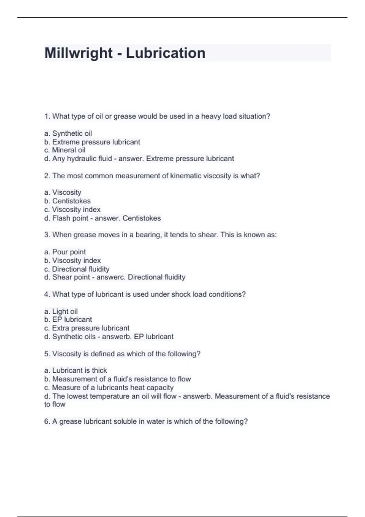 Millwright - Lubrication Questions and Answers Graded A+