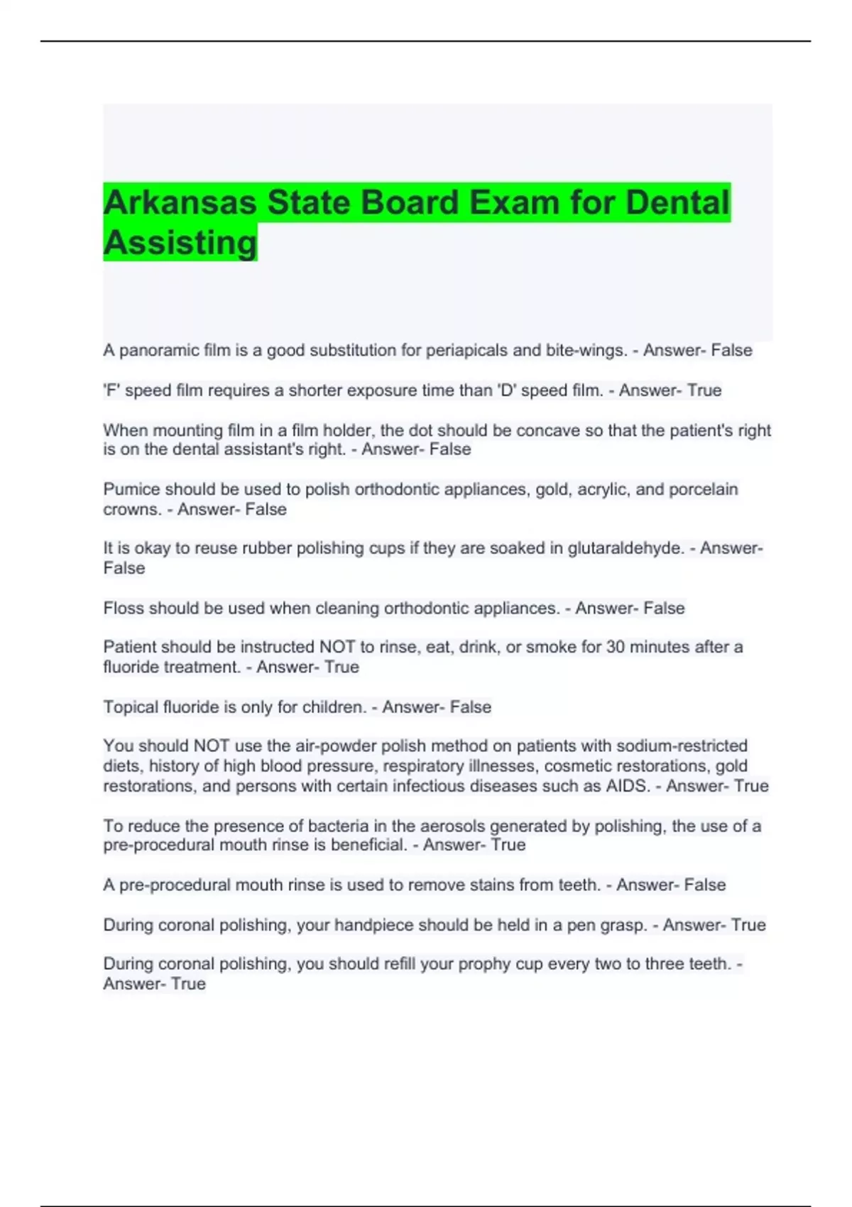Arkansas State Board Exam for Dental Assisting Questions with correct Answers