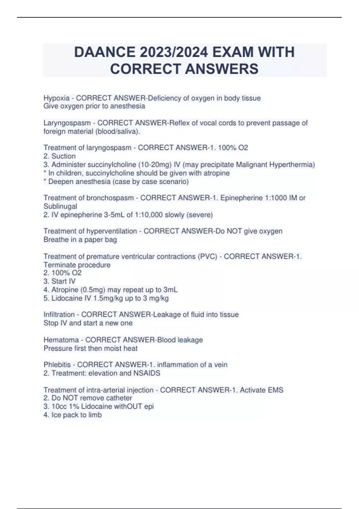 DAANCE 2023/2024 EXAM WITH CORRECT ANSWERS Hypoxia - CORRECT ANSWER-Deficiency of oxygen in body tissue Give oxygen prior to anesthesia Laryngospasm - CORRECT ANSWER-Reflex of vocal cords to prevent passage of foreign material (blood/saliva). Treatment of laryngospasm - CORRECT ANSWER-1. 100% O2 2. Suction 3. Administer succinylcholine (10-20mg) IV (may precipitate Malignant Hyperthermia) * In children, succinylcholine should be given with atropine * Deepen anesthesia (case by case scenario) Treatment of bronchospasm - CORRECT ANSWER-1. Epinepherine 1:1000 IM or Sublinugal 2. IV epinepherine 3-5mL of 1:10,000 slowly (severe) Treatment of hyperventilation - CORRECT ANSWER-Do NOT give oxygen Breathe in a paper bag Treatment of premature ventricular contractions (PVC) - CORRECT ANSWER-1. Terminate procedure 2. 100% O2 3. Start IV 4. Atropine (0.5mg) may repeat up to 3mL 5. Lidocaine IV 1.5mg/kg up to 3 mg/kg Infiltration - CORRECT ANSWER-Leakage of fluid into tissue Stop IV and start a new one Hematoma - CORRECT ANSWER-Blood leakage Pressure first then moist heat Phlebitis - CORRECT ANSWER-1. inflammation of a vein 2. Treatment: elevation and NSAIDS Treatment of intra-arterial injection - CORRECT ANSWER-1. Activate EMS 2. Do NOT remove catheter 3. 10cc 1% Lidocaine withOUT epi 4. Ice pack to limb Treatment of severe hypoglycemia - CORRECT ANSWER-1. Activate EMS 2. 1 amp IV glucose (50mL of 50% glucose) 3. IV infusion of dextrose (5-20% in water) Treatment of acute adrenal insufficiency (lack of cortisol) - CORRECT ANSWER-1. Terminate procedure 2. Vitals 3. Trendelenburg if hypotensive 4. Activate EMS 5. Decadron 4mg IV or IM 6. 10-20mL fluid bolu