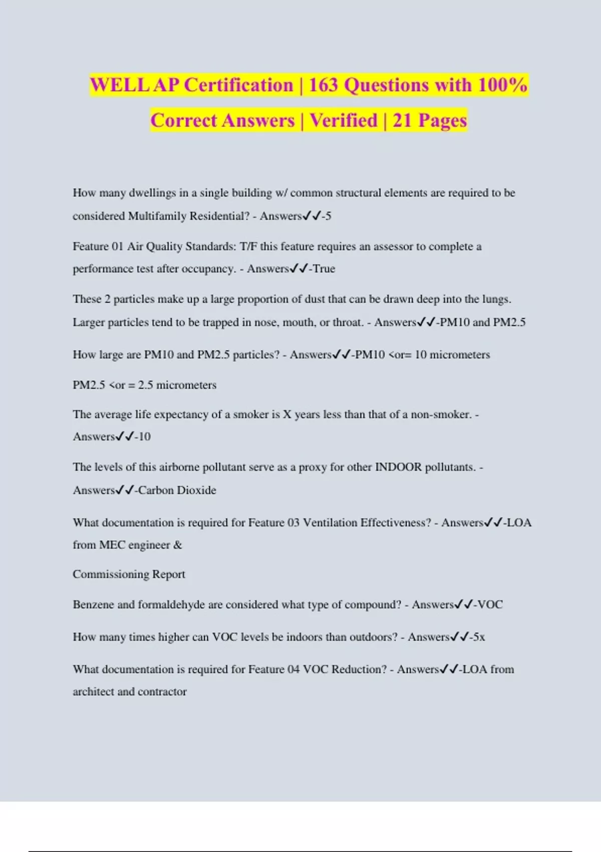 WELL AP Certification | 163 Questions with 100% Correct Answers | Verified | 21 Pages How many dwellings in a single building w/ common structural elements are required to be considered Multifamily Residential? - Answers️️ -5 Feature 01 Air Quality Standards: T/F this feature requires an assessor to complete a performance test after occupancy. - Answers️️ -True These 2 particles make up a large proportion of dust that can be drawn deep into the lungs. Larger particles tend to be trapped in nose, mouth, or throat. - Answers️️ -PM10 and PM2.5 How large are PM10 and PM2.5 particles? - Answers️️ -PM10 <or= 10 micrometers PM2.5 <or = 2.5 micrometers The average life expectancy of a smoker is X years less than that of a non-smoker. - Answers️️ -10 The levels of this airborne pollutant serve as a proxy for other INDOOR pollutants. - Answers️️ -Carbon Dioxide What documentation is required for Feature 03 Ventilation Effectiveness? - Answers️️ -LOA from MEC engineer & Commissioning Report Benzene and formaldehyde are considered what type of compound? - Answers️️ -VOC How many times higher can VOC levels be indoors than outdoors? - Answers️️ -5x What documentation is required for Feature 04 VOC Reduction? - Answers️️ -LOA from architect and contractor What type of filters are designed to absorb VOCs and remove the largest particles? - Answers️️ -Carbon filters This type of filter is meant to remove smaller particles. - Answers️️ -Media filter (i.e. MERV 13). The higher the MERV #, the smaller the particle it removes. What documentation is required for Feature 05 Air Filtration? - Answers️️ -For parts 1 & 2 Filter Accommodation & Particle Filtration = LOA from MEP Engineer & Spot Check Part 3 Air Filtration Maintenance = operations schedule ultraviolet germicidal irradiation (UVGI) - Answers️️ -A sterilisation method that uses UV light to break down microorganisms by destroying their DNA. Often used in food, air, and water purification. Destroys bacteria, virus, and mould spores. What documentation is required for Feature 07 Construction Pollution Management? - Answers️️ -LOA from Contractor What 5 items should the Feature 09 Cleaning Protocol document address? - Answers️️ -1. Frequency 2. Procedures 3. Equipment 4. Supplies 5. Training to improve cleaning regimens What is Atrazine? - Answers️️ -One of the most widely used pesticides, and a suspected endocrine disruptor associated with cardiovascular problems. Long-term exposure to this widely used herbicide may lead to kidney and reproductive problems. - Answers️️ -Glyphosate Exposure to asbestos can occur how? - Answers️️ -Via inhalation when building materials degrade over time or are disturbed during renovation/construction. Asbestos is associated with what 2 diseases? - Answers️️ -Mesothelioma Lung Cancer What effects can lead exposure have? - Answers️️ -Neurotoxic effects. In early development it's associated with negative effects on memory, IQ, learning, and behaviour. In what 4 ways can moisture enter buildings and building assemblies? - Answers️️ -1. Bulk water 2. Capillary water 3. Air-transported mois