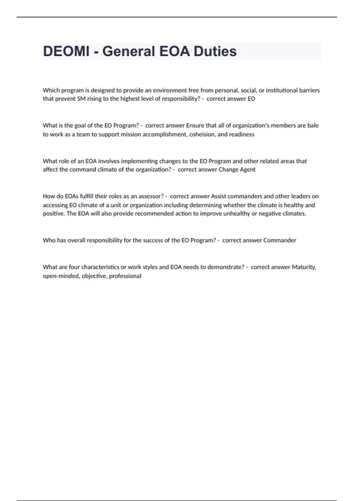 DEOMI - General EOA Duties verified already passed 2024/2025 Which program is designed to provide an environment free from personal, social, or institutional barriers that prevent SM rising to the highest level of responsibility? - correct answer EO What is the goal of the EO Program? - correct answer Ensure that all of organization's members are bale to work as a team to support mission accomplishment, coheision, and readiness What role of an EOA involves implementing changes to the EO Program and other related areas that affect the command climate of the organization? - correct answer Change Agent How do EOAs fulfill their roles as an assessor? - correct answer Assist commanders and other leaders on accessing EO climate of a unit or organization including determining whether the climate is healthy and positive. The EOA will also provide recommended action to improve unhealthy or negative climates. Who has overall responsibility for the success of the EO Program? - correct answer Commander What are four characteristics or work styles and EOA needs to demonstrate? - correct answer Maturity, open-minded, objective, professional