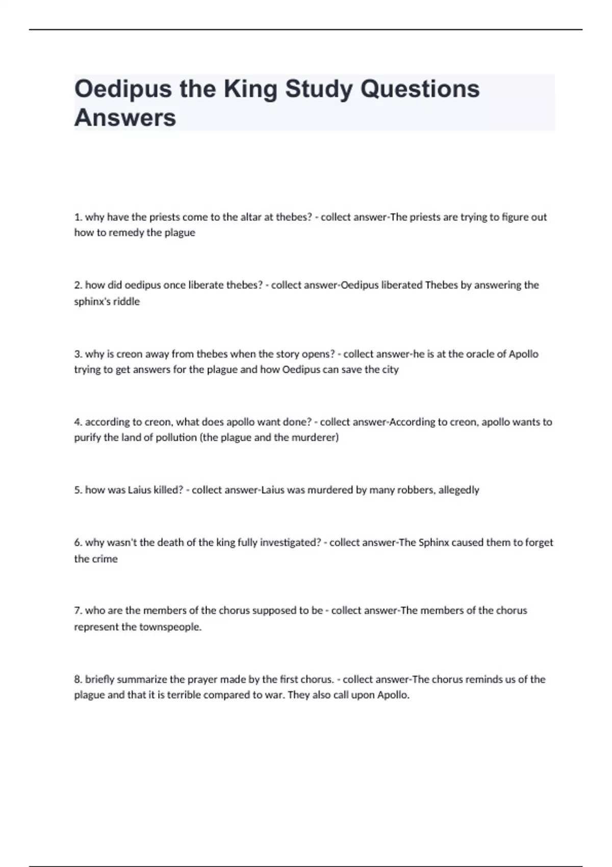 1. why have the priests come to the altar at thebes? - collect answer-The priests are trying to figure out how to remedy the plague 2. how did oedipus once liberate thebes? - collect answer-Oedipus liberated Thebes by answering the sphinx's riddle 3. why is creon away from thebes when the story opens? - collect answer-he is at the oracle of Apollo trying to get answers for the plague and how Oedipus can save the city 4. according to creon, what does apollo want done? - collect answer-According to creon, apollo wants to purify the land of pollution (the plague and the murderer) 5. how was Laius killed? - collect answer-Laius was murdered by many robbers, allegedly 6. why wasn't the death of the king fully investigated? - collect answer-The Sphinx caused them to forget the crime 7. who are the members of the chorus supposed to be - collect answer-The members of the chorus represent the townspeople. 8. briefly summarize the prayer made by the first chorus. - collect answer-The chorus reminds us of the plague and that it is terrible compared to war. They also call upon Apollo.