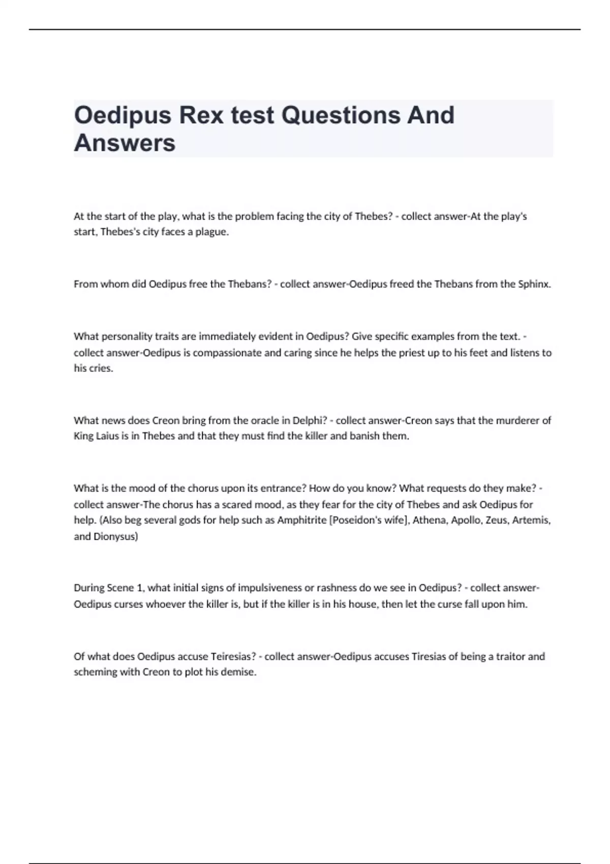 At the start of the play, what is the problem facing the city of Thebes? - collect answer-At the play's start, Thebes's city faces a plague. From whom did Oedipus free the Thebans? - collect answer-Oedipus freed the Thebans from the Sphinx. What personality traits are immediately evident in Oedipus? Give specific examples from the text. - collect answer-Oedipus is compassionate and caring since he helps the priest up to his feet and listens to his cries. What news does Creon bring from the oracle in Delphi? - collect answer-Creon says that the murderer of King Laius is in Thebes and that they must find the killer and banish them. What is the mood of the chorus upon its entrance? How do you know? What requests do they make? - collect answer-The chorus has a scared mood, as they fear for the city of Thebes and ask Oedipus for help. (Also beg several gods for help such as Amphitrite [Poseidon's wife], Athena, Apollo, Zeus, Artemis, and Dionysus) During Scene 1, what initial signs of impulsiveness or rashness do we see in Oedipus? - collect answer-Oedipus curses whoever the killer is, but if the killer is in his house, then let the curse fall upon him. Of what does Oedipus accuse Teiresias? - collect answer-Oedipus accuses Tiresias of being a traitor and scheming with Creon to plot his demise.
