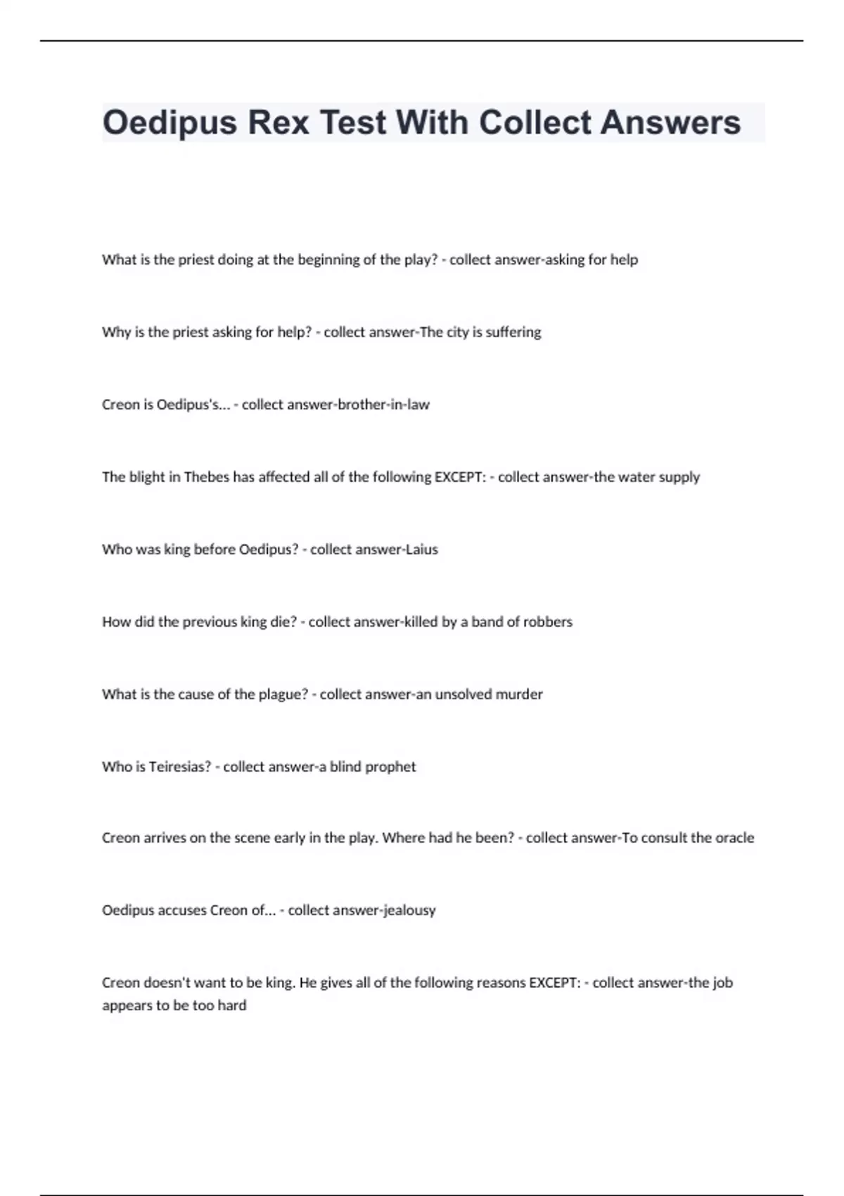 What is the priest doing at the beginning of the play? - collect answer-asking for help Why is the priest asking for help? - collect answer-The city is suffering Creon is Oedipus's... - collect answer-brother-in-law The blight in Thebes has affected all of the following EXCEPT: - collect answer-the water supply Who was king before Oedipus? - collect answer-Laius How did the previous king die? - collect answer-killed by a band of robbers What is the cause of the plague? - collect answer-an unsolved murder Who is Teiresias? - collect answer-a blind prophet Creon arrives on the scene early in the play. Where had he been? - collect answer-To consult the oracle Oedipus accuses Creon of... - collect answer-jealousy Creon doesn't want to be king. He gives all of the following reasons EXCEPT: - collect answer-the job appears to be too hard