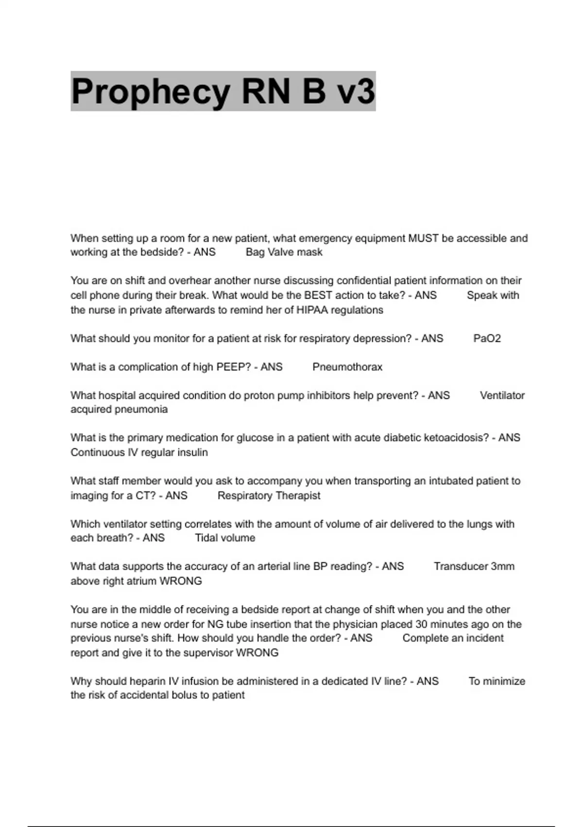 Prophecy RN B v3 When setting up a room for a new patient, what emergency equipment MUST be accessible and working at the bedside? - ANS Bag Valve mask You are on shift and overhear another nurse discussing confidential patient information on their cell phone during their break. What would be the BEST action to take? - ANS Speak with the nurse in private afterwards to remind her of HIPAA regulations What should you monitor for a patient at risk for respiratory depression? - ANS PaO2 What is a complication of high PEEP? - ANS Pneumothorax What hospital acquired condition do proton pump inhibitors help prevent? - ANS Ventilator acquired pneumonia What is the primary medication for glucose in a patient with acute diabetic ketoacidosis? - ANS Continuous IV regular insulin What staff member would you ask to accompany you when transporting an intubated patient to imaging for a CT? - ANS Respiratory Therapist Which ventilator setting correlates with the amount of volume of air delivered to the lungs with each breath? - ANS Tidal volume What data supports the accuracy of an arterial line BP reading? - ANS Transducer 3mm above right atrium WRONG You are in the middle of receiving a bedside report at change of shift when you and the other nurse notice a new order for NG tube insertion that the physician placed 30 minutes ago on the previous nurse's shift. How should you handle the order? - ANS Complete an incident report and give it to the supervisor WRONG Why should heparin IV infusion be administered in a dedicated IV line? - ANS To minimize the risk of accidental bolus to patient You have received an order to remove your patient's surgical staples. What assessment finding indicates the need for further discussion with the ordering provider? - ANS Gap between sides of incision