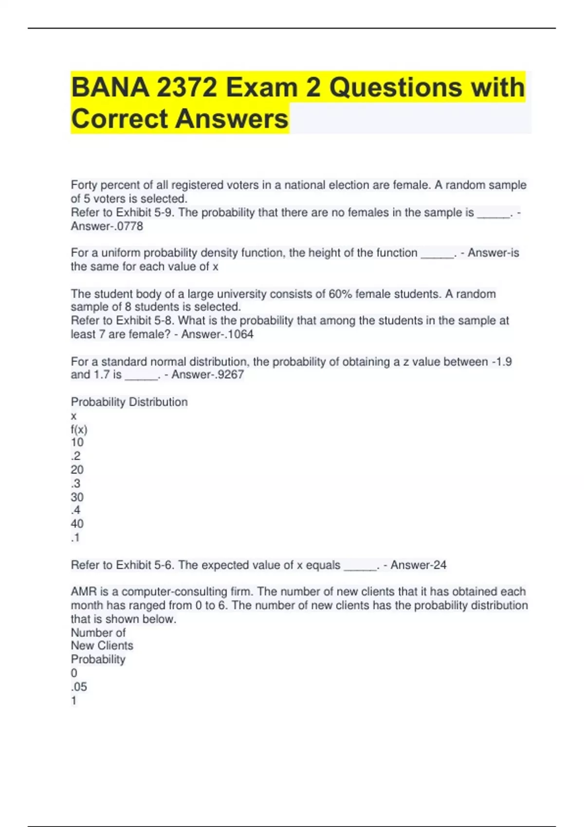 BANA 2372 Exam 2 Questions with Correct Answers Forty percent of all registered voters in a national election are female. A random sample of 5 voters is selected. Refer to Exhibit 5-9. The probability that there are no females in the sample is _____. - Answer-.0778 For a uniform probability density function, the height of the function _____. - Answer-is the same for each value of x The student body of a large university consists of 60% female students. A random sample of 8 students is selected. Refer to Exhibit 5-8. What is the probability that among the students in the sample at least 7 are female? - Answer-.1064 For a standard normal distribution, the probability of obtaining a z value between -1.9 and 1.7 is _____. - Answer-.9267 Probability Distribution x f(x) 10 .2 20 .3 30 .4 40 .1 Refer to Exhibit 5-6. The expected value of x equals _____. - Answer-24