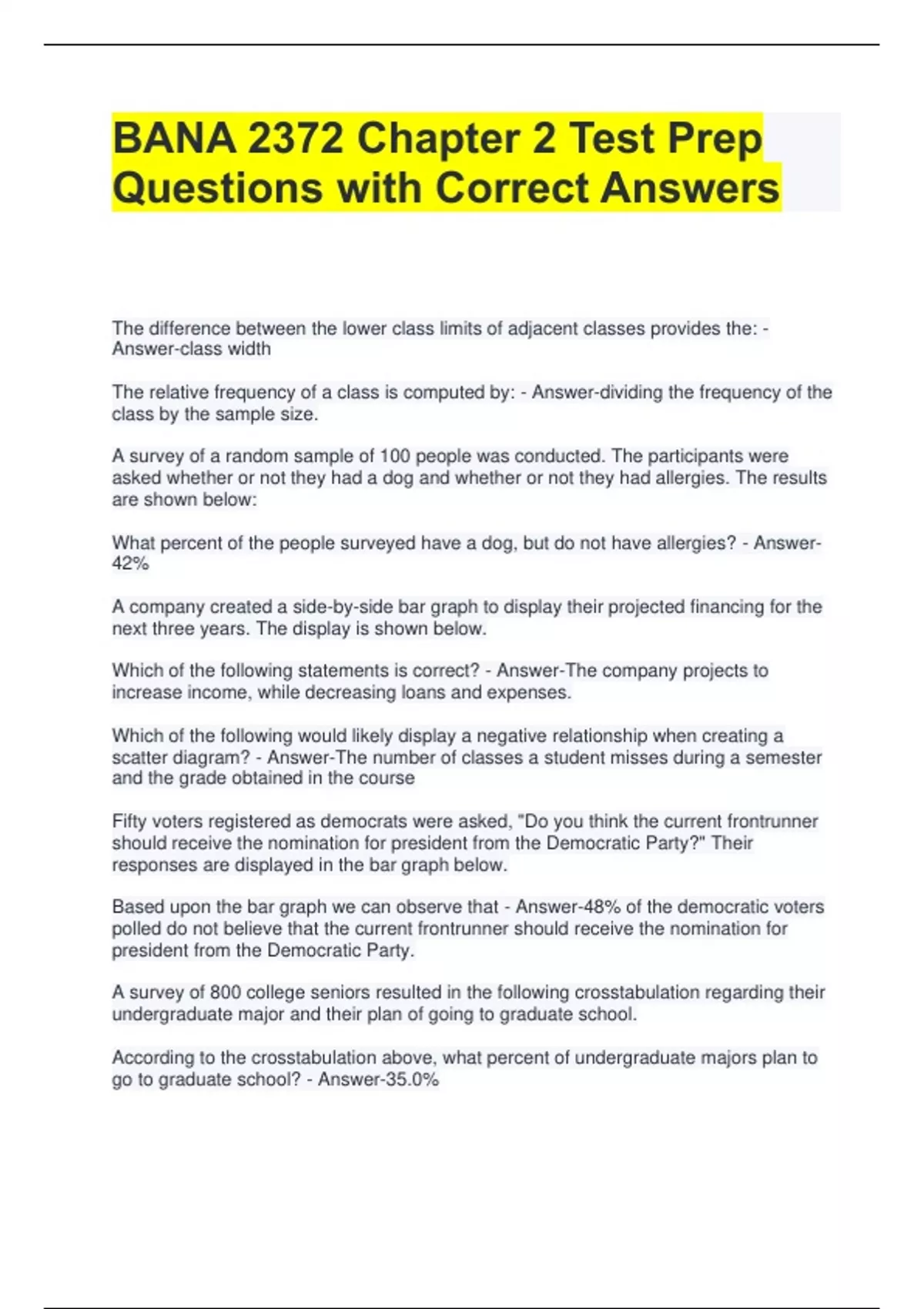 BANA 2372 Chapter 2 Test Prep Questions with Correct Answers The difference between the lower class limits of adjacent classes provides the: - Answer-class width The relative frequency of a class is computed by: - Answer-dividing the frequency of the class by the sample size. A survey of a random sample of 100 people was conducted. The participants were asked whether or not they had a dog and whether or not they had allergies. The results are shown below: What percent of the people surveyed have a dog, but do not have allergies? - Answer-42% A company created a side-by-side bar graph to display their projected financing for the next three years. The display is shown below. Which of the following statements is correct? - Answer-The company projects to increase income, while decreasing loans and expenses. Which of the following would likely display a negative relationship when creating a scatter diagram? - Answer-The number of classes a student misses during a semester and the grade obtained in the course Fifty voters registered as democrats were asked, "Do you think the current frontrunner should receive the nomination for president from the Democratic Party?" Their responses are displayed in the bar graph below. Based upon the bar graph we can observe that - Answer-48% of the democratic voters polled do not believe that the current frontrunner should receive the nomination for president from the Democratic Party. A survey of 800 college seniors resulted in the following crosstabulation regarding their undergraduate major and their plan of going to graduate school.