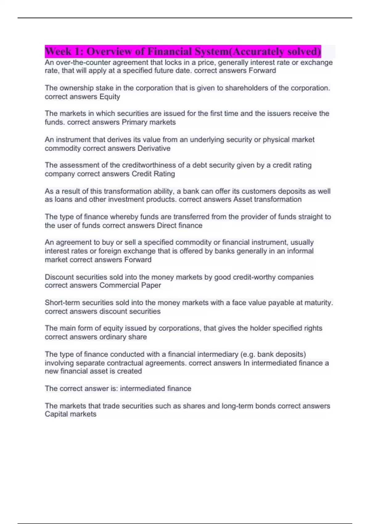An over-the-counter agreement that locks in a price, generally interest rate or exchange rate, that will apply at a specified future date. correct answers Forward The ownership stake in the corporation that is given to shareholders of the corporation. correct answers Equity The markets in which securities are issued for the first time and the issuers receive the funds. correct answers Primary markets An instrument that derives its value from an underlying security or physical market commodity correct answers Derivative The assessment of the creditworthiness of a debt security given by a credit rating company correct answers Credit Rating As a result of this transformation ability, a bank can offer its customers deposits as well as loans and other investment products. correct answers Asset transformation The type of finance whereby funds are transferred from the provider of funds straight to the user of funds correct answers Direct finance An agreement to buy or sell a specified commodity or financial instrument, usually interest rates or foreign exchange that is offered by banks generally in an informal market correct answers Forward Discount securities sold into the money markets by good credit-worthy companies correct answers Commercial Paper Short-term securities sold into the money markets with a face value payable at maturity. correct answers discount securities The main form of equity issued by corporations, that gives the holder specified rights correct answers ordinary share The type of finance conducted with a financial intermediary (e.g. bank deposits) involving separate contractual agreements. correct answers In intermediated finance a new financial asset is created The correct answer is: intermediated finance The markets that trade securities such as shares and long-term bonds correct answers Capital markets
