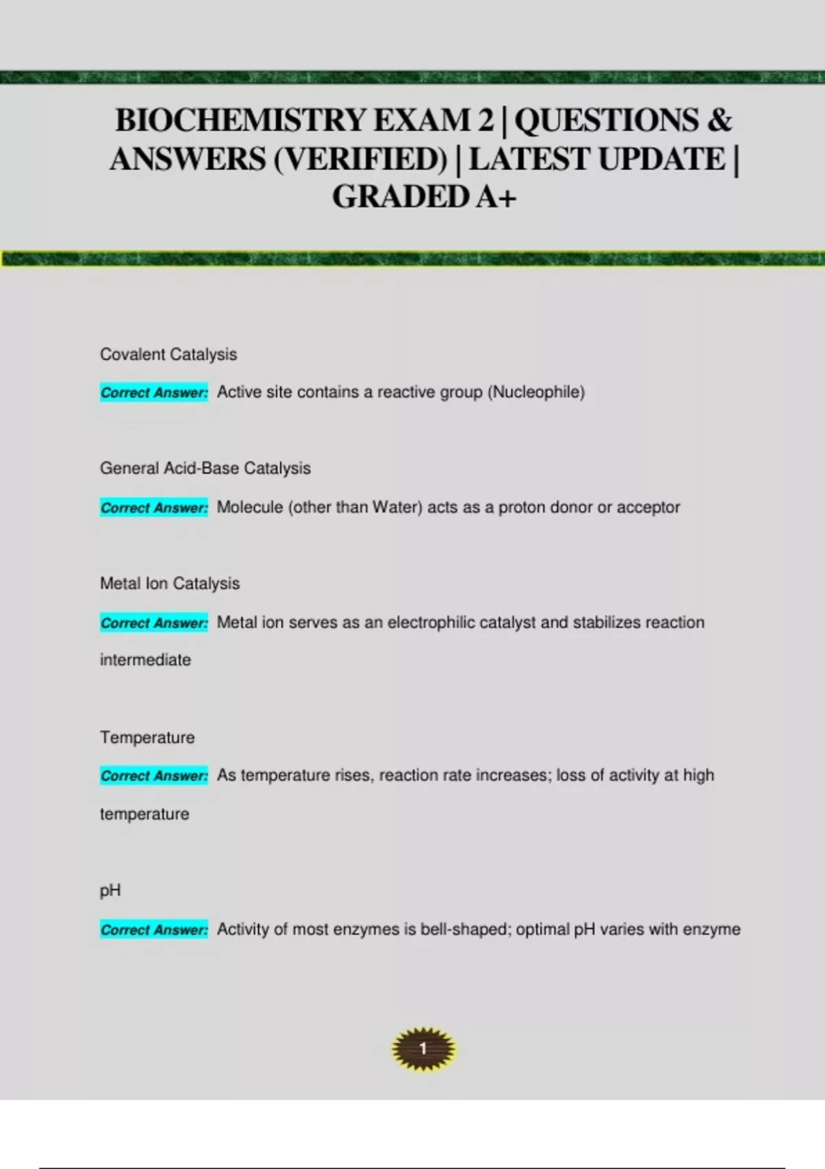 BIOCHEMISTRY EXAM 2 | QUESTIONS & ANSWERS (VERIFIED) | LATEST UPDATE | GRADED A+ Covalent Catalysis Correct Answer: Active site contains a reactive group (Nucleophile) General Acid-Base Catalysis Correct Answer: Molecule (other than Water) acts as a proton donor or acceptor Metal Ion Catalysis Correct Answer: Metal ion serves as an electrophilic catalyst and stabilizes reaction intermediate Temperature Correct Answer: As temperature rises, reaction rate increases; loss of activity at high temperature pH Correct Answer: Activity of most enzymes is bell-shaped; optimal pH varies with enzyme 2 Reversible Enzymes Correct Answer: Rapid dissociation of enzyme-inhibitor complex; 3 types: competitive, uncompetitive, noncompetitive Competitive Inhibition Correct Answer: Inhibitor resembles substrate and binds to active site of enzyme Uncompetitive Inhibition Correct Answer: Inhibitor binds only to enzyme-substrate complex and cannot be overcome by adding more substrate Noncompetitive Inhibition Correct Answer: Inhibitor and substrate can bind simultaneously to enzyme, decreases overall number of active enzymes Irreversible Inhibition Correct Answer: Inhibitor dissociates very slowly from target enzyme, tightly bound covalently or non-covalentl