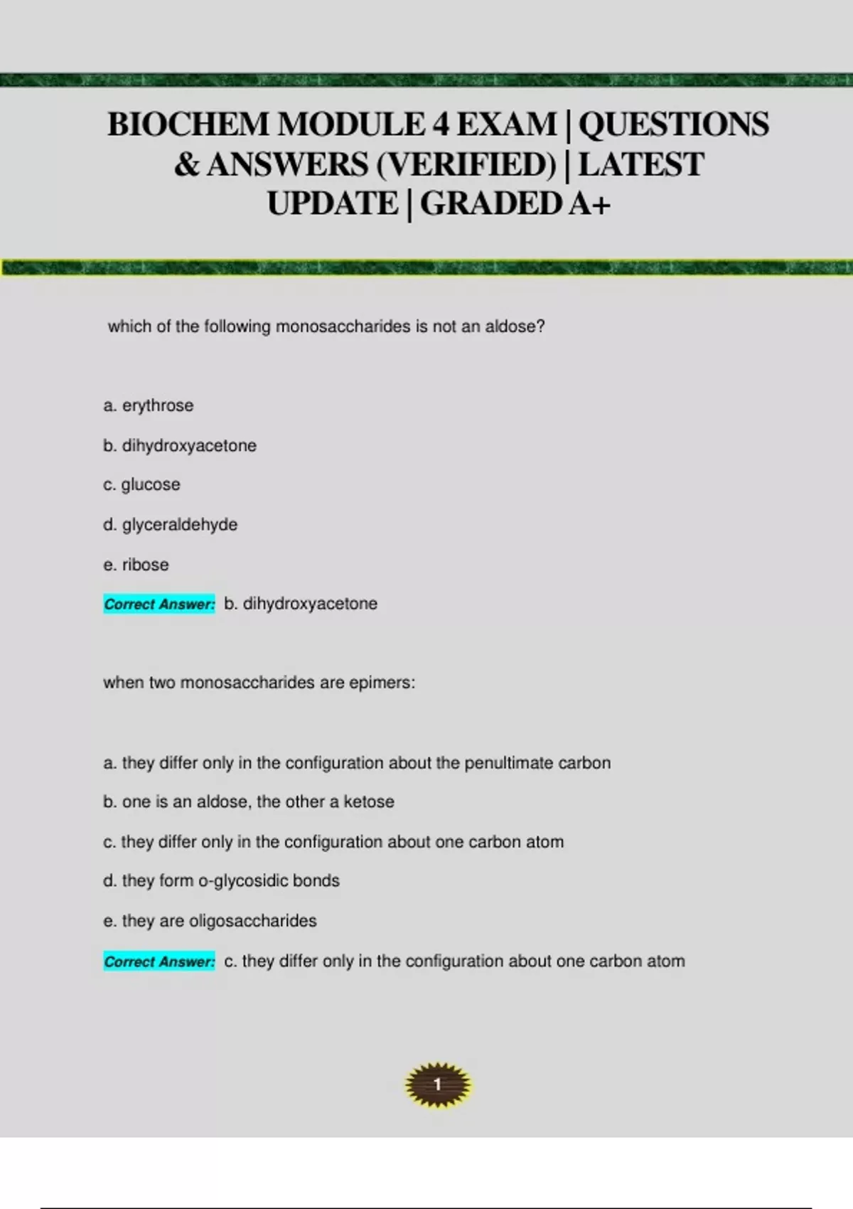 BIOCHEM MODULE 4 EXAM | QUESTIONS & ANSWERS (VERIFIED) | LATEST UPDATE | GRADED A+ which of the following monosaccharides is not an aldose? a. erythrose b. dihydroxyacetone c. glucose d. glyceraldehyde e. ribose Correct Answer: b. dihydroxyacetone when two monosaccharides are epimers: a. they differ only in the configuration about the penultimate carbon b. one is an aldose, the other a ketose c. they differ only in the configuration about one carbon atom d. they form o-glycosidic bonds e. they are oligosaccharides Correct Answer: c. they differ only in the configuration about one carbon atom 2 which pair is anomeric? a. D-glucose and D-fructose b. D-glucose and L-fructose c. D-glucose and L-glucose d. alpha-D-glucose and beta-D-fructose e. alpha-D-glucose and beta-D-glucose Correct Answer: e. alpha-D-glucose and beta-D-glucose lactose is made from linking galactose and glucose. when this happens: a. a polysaccharide is formed b. gas is eliminated c. an epimer is formed d. an anomeric carbon is formed on carbon-1 e. lactose forms by a condensation reaction Correct Answer: e. lactose forms by a condensation reaction lactose is made from linking galactose and glucose. when this happens: a. gas is eliminated b. an anomeric carbon is formed on carbon-1 c. water is release