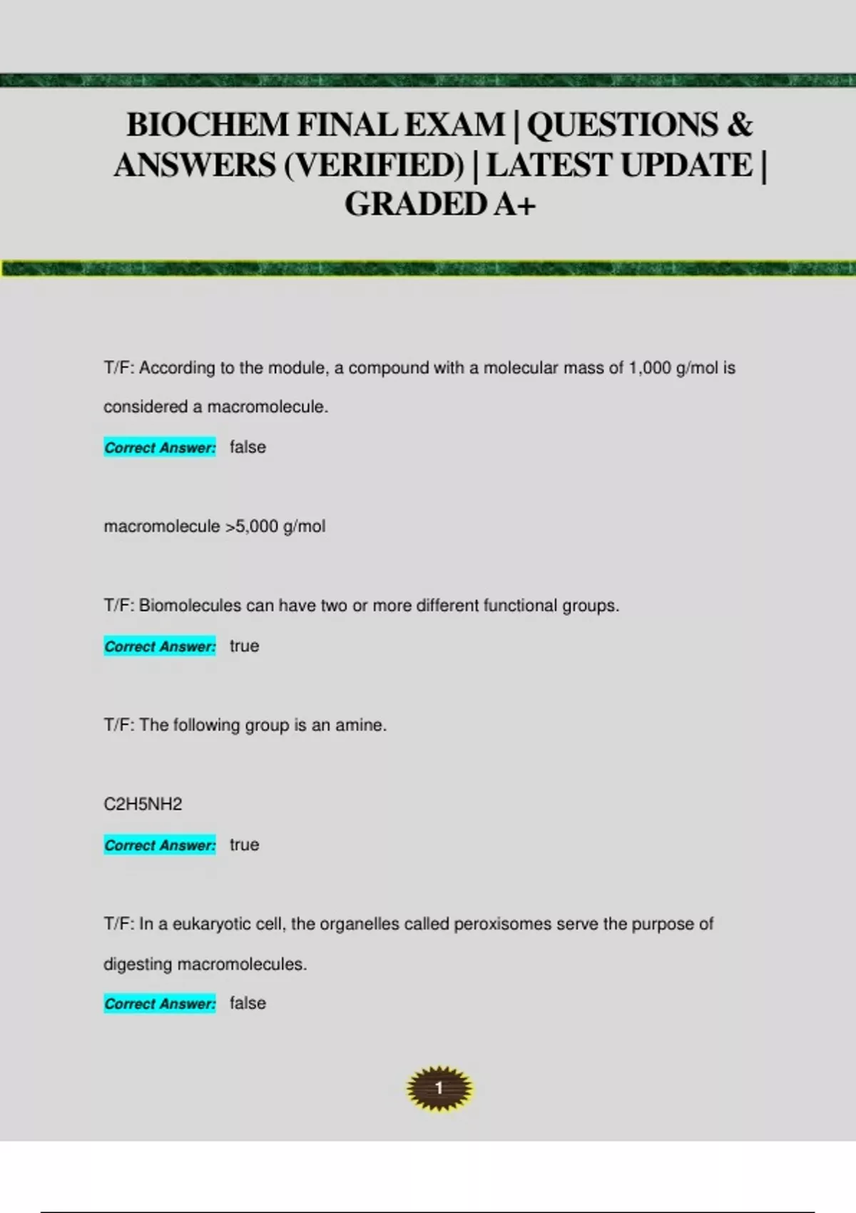 BIOCHEM FINAL EXAM | QUESTIONS & ANSWERS (VERIFIED) | LATEST UPDATE | GRADED A+ T/F: According to the module, a compound with a molecular mass of 1,000 g/mol is considered a macromolecule. Correct Answer: false macromolecule >5,000 g/mol T/F: Biomolecules can have two or more different functional groups. Correct Answer: true T/F: The following group is an amine. C2H5NH2 Correct Answer: true T/F: In a eukaryotic cell, the organelles called peroxisomes serve the purpose of digesting macromolecules. Correct Answer: false 2 peroxisomes degrade dangerous/hazardous molecules, lysosomes degrade macromolecules T/F: In a eukaryotic cell, the organelles called lysosomes serve the purpose of digesting macromolecules. Correct Answer: true T/F: Carbon dioxide has a linear molecular shape AND has a bond angle of 109.5 degrees. Correct Answer: false linear shape = 180 degrees Of the following, ___ is not a property of carbon. Forming ionic bonds Forming cyclic structures Forming multiple bonds Forming bonds with oxygen Bonding in long chains Correct Answer: Forming ionic b