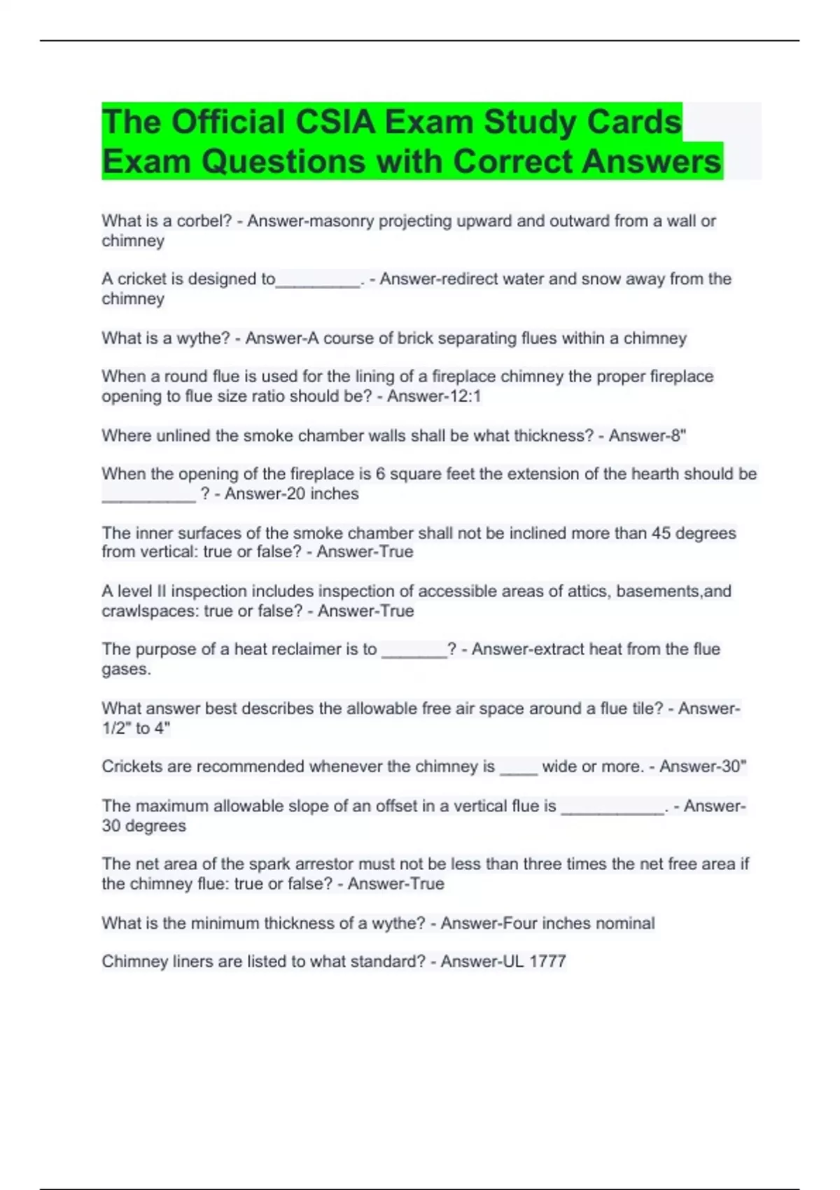 The Official CSIA Exam Study Cards Exam Questions with Correct Answers A Type L vent is used for low temp oil appliances and gas appliances: true or false? - Answer-True Unlisted appliances with legs providing 6 inches (or more) of ventilation under the appliance require which of the following hearths: - Answer-2 inches of brick covered with 24 gauge sheetmetal Connector pipes or thimble should extend into the flue how far? - Answer-flush with interior flue wall Connector pipes must be secured with at least ______screws. - Answer-3 The formula for determining the cross sectional area of a square or rectangular flue is pi x r2: true or false? - Answer-False Two major factors influence the amount of draft, which two (of the choices below) best describe them? -height and btus of chimney -temperature difference between the outside and the flue gas temperature,chimney height -lateral run of connector pipe and heights of chimney -temperature of flue gases and cross sectional area of flue - Answer-temperature difference between the outside and the flue gas temperature,chimney height The height of the smoke chamber should be no taller than _____. - Answer-width of fireplace opening Connectors shall maintain a pitch or rise of ________inch per foot of horizontal length of pipe from the appliance to the chimney or vent. - Answer-1/4 Thermal shock can be caused from ___________. - Answer-a sudden rise in temperature or drastic reduction in temperature Vent and chimney connectors shall not be covered with insulation. - Answer-True Where constructed of standard brick without a firebrick liner, the smoke chamber wall thickness shall not be less than _____________. - Answer-8 inches Woodwork such as mantels and other combustible material can be placed within 5 inches of fireplace opening: true or false? - Answer-False