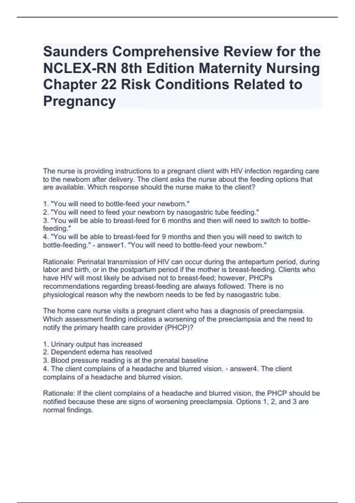 labor and birth, or in the postpartum period if the mother is breast-feeding. Clients who have HIV will most likely be advised not to breast-feed; however, PHCPs recommendations regarding breast-feeding are always followed. There is no physiological reason why the newborn needs to be fed by nasogastric tube.
