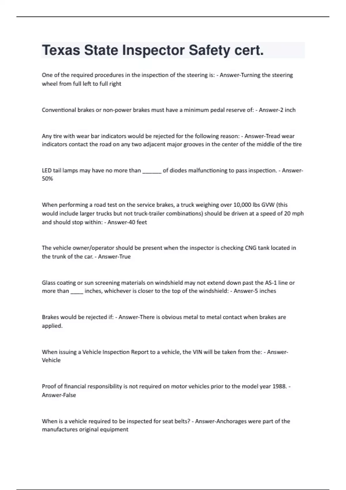One of the required procedures in the inspection of the steering is: - Answer-Turning the steering wheel from full left to full right Conventional brakes or non-power brakes must have a minimum pedal reserve of: - Answer-2 inch Any tire with wear bar indicators would be rejected for the following reason: - Answer-Tread wear indicators contact the road on any two adjacent major grooves in the center of the middle of the tire LED tail lamps may have no more than ______ of diodes malfunctioning to pass inspection. - Answer- 50% When performing a road test on the service brakes, a truck weighing over 10,000 lbs GVW (this would include larger trucks but not truck-trailer combinations) should be driven at a speed of 20 mph and should stop within: - Answer-40 feet The vehicle owner/operator should be present when the inspector is checking CNG tank located in the trunk of the car. - Answer-True Glass coating or sun screening materials on windshield may not extend down past the AS-1 line or more than ____ inches, whichever is closer to the top of the windshield: - Answer-5 inches Brakes would be rejected if: - Answer-There is obvious metal to metal contact when brakes are applied. When issuing a Vehicle Inspection Report to a vehicle, the VIN will be taken from the: - AnswerVehicle Proof of financial responsibility is not required on motor vehicles prior to the model year 1988. - Answer-False When is a vehicle required to be inspected for seat belts? - Answer-Anchorages were part of the manufactures original equipmentThe turn signal selector switch must lock in the proper position when applied on: - Answer-All vehicles A truck or trailer is required to have clearance lamps and side marker lamps if the total width of the vehicle is: - Answer-80 inches or more In order to pass inspection, tires must have a tread depth of at least ___ in the two center adjacent major grooves. - Answer-2/32 inch A parking brake is required to be inspected on all cars and trucks beginning with the model year: - Answer-1960 The exhaust system includes the following: - Answer-Manifold, Exhaust Pipe, Muffler(All of the above) A muffler with a hole which has been patched: - Answer-Will be rejected Fluid level in the brake master cylinder must not be more than how many inches below the top of the reservoir? - Answer-1 inch When using a window tint meter, the amount of light transmission cannot be less than? - Answer- 25% When required, safety guards or flaps must be what width? - Answer-At least as wide as the tires they are protecting. Sun screening or glass coating material will be an item of inspection on the following vehicles: - Answer-All vehicles regardless of year A motor vehicle originally equipped with a catalytic converter will be rejected if the catalytic converter has been removed or disconnected beginning with year model - Answer-1984 When checking operation of the headlamps, a vehicle will be rejected if: - Answer-Physical damage would obviously cause a handlamp beam to fail to sufficiently illuminate the roadway ahead of the vehicleA license plate lamp must be white in color and rejected for: - Answer-Mounting, Shoddy wiring, Lamp lens is broken or does not fit properly(All of the above) Mirrors would be rejected if: - Answer-Reflecting surface is cracked, peeled, or tarnished, mirror interferes with driver's forward vision, mirror does not afford a clear view to the rear(Any of the above) What color tail lamps are required to pass inspection? - Answer-Red