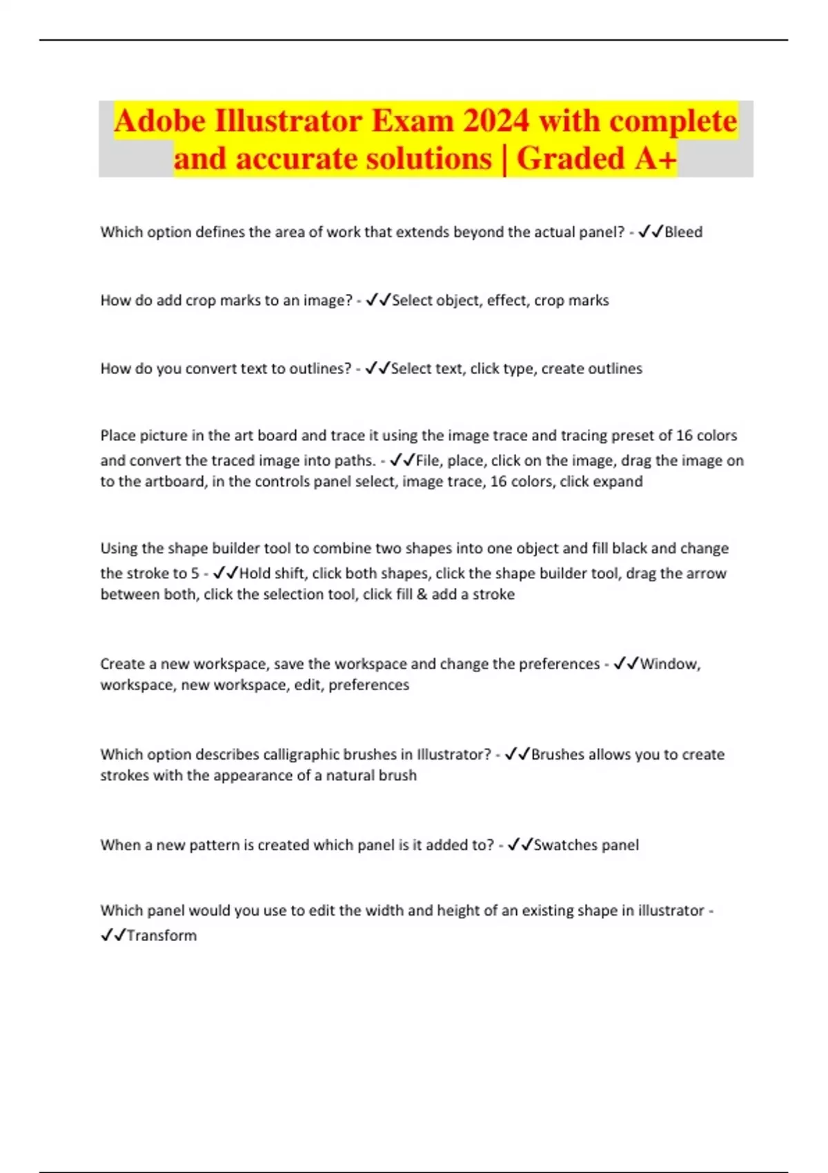 Which option defines the area of work that extends beyond the actual panel? - Bleed How do add crop marks to an image? - Select object, effect, crop marks How do you convert text to outlines? - Select text, click type, create outlines Place picture in the art board and trace it using the image trace and tracing preset of 16 colors and convert the traced image into paths. - File, place, click on the image, drag the image on to the artboard, in the controls panel select, image trace, 16 colors, click expand Using the shape builder tool to combine two shapes into one object and fill black and change the stroke to 5 - Hold shift, click both shapes, click the shape builder tool, drag the arrow between both, click the selection tool, click fill & add a stroke Create a new workspace, save the workspace and change the preferences - Window, workspace, new workspace, edit, preferences Which option describes calligraphic brushes in Illustrator? - Brushes allows you to create strokes with the appearance of a natural brush When a new pattern is created which panel is it added to? - Swatches panel Which panel would you use to edit the width and height of an existing shape in illustrator - TransformFor the selected object change the fill color using swatches and the stroke color to swatch black and the stroke weight - Open the swatches panel & change the fill color and stroke, go to the control panel to change the stroke Which statement accurately describes lin