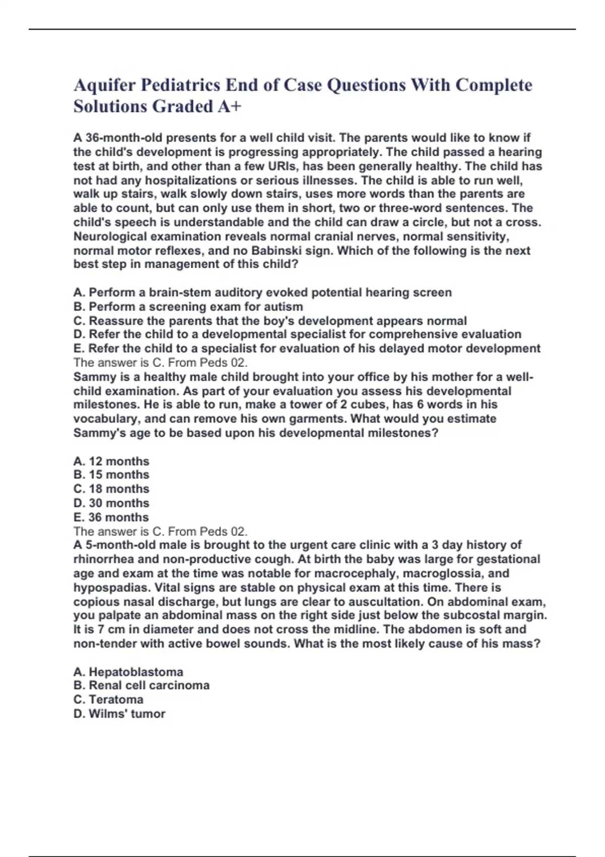 Aquifer Pediatrics End of Case Questions With Complete Solutions Graded A+ A 36-month-old presents for a well child visit. The parents would like to know if the child's development is progressing appropriately. The child passed a hearing test at birth, and other than a few URIs, has been generally healthy. The child has not had any hospitalizations or serious illnesses. The child is able to run well, walk up stairs, walk slowly down stairs, uses more words than the parents are able to count, but can only use them in short, two or three-word sentences. The child's speech is understandable and the child can draw a circle, but not a cross. Neurological examination reveals normal cranial nerves, normal sensitivity, normal motor reflexes, and no Babinski sign. Which of the following is the next best step in management of this child? A. Perform a brain-stem auditory evoked potential hearing screen B. Perform a screening exam for autism C. Reassure the parents that the boy's development appears normal D. Refer the child to a developmental specialist for comprehensive evaluation E. Refer the child to a specialist for evaluation of his delayed motor development The answer is C. From Peds 02. Sammy is a healthy male child brought into your office by his mother for a well-child examination. As part of your evaluation you assess his developmental milestones. He is able to run, make a tower of 2 cubes, has 6 words in his vocabulary, and can remove his own garments. What would you estimate Sammy's age to be based upon his developmental milestones? A. 12 months B. 15 months C. 18 months D. 30 months E. 36 months The answer is C. From Peds 02. A 5-month-old male is brought to the urgent care clinic with a 3 day history of rhinorrhea and non-productive cough. At birth the baby was large for gestational age and exam at the time was notable for macrocephaly, macroglossia, and hypospadias. Vital signs are stable on physical exam at this time. There is copious nasal discharge, but lungs are clear to auscultation. On abdominal exam, you palpate an abdominal mass on the right side just below the subcostal margin. It is 7 cm in diameter and does not cross the midline. The abdomen is soft and non-tender with active bowel sounds. What is the most likely cause of his mass? A. Hepatoblastoma B. Renal cell carcinoma C. Teratoma D. Wilms' tumor
