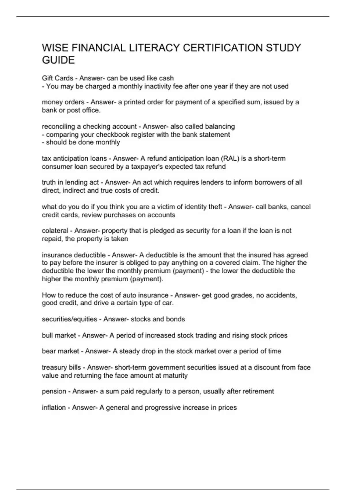 WISE FINANCIAL LITERACY CERTIFICATION STUDY GUIDE