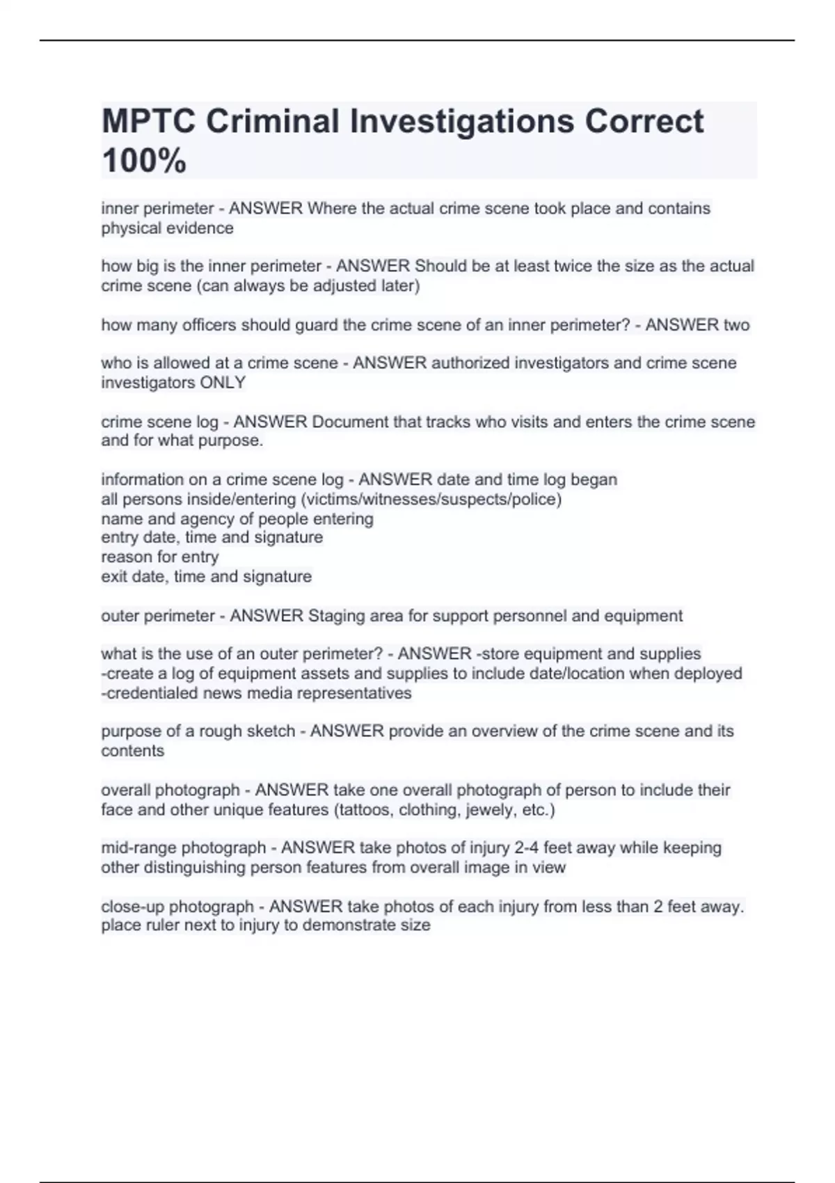 inner perimeter - ANSWER Where the actual crime scene took place and contains physical evidence how big is the inner perimeter - ANSWER Should be at least twice the size as the actual crime scene (can always be adjusted later) how many officers should guard the crime scene of an inner perimeter? - ANSWER two who is allowed at a crime scene - ANSWER authorized investigators and crime scene investigators ONLY crime scene log - ANSWER Document that tracks who visits and enters the crime scene and for what purpose. information on a crime scene log - ANSWER date and time log began all persons inside/entering (victims/witnesses/suspects/police) name and agency of people entering entry date, time and signature reason for entry exit date, time and signature outer perimeter - ANSWER Staging area for support personnel and equipment what is the use of an outer perimeter? - ANSWER -store equipment and supplies -create a log of equipment assets and supplies to include date/location when deployed -credentialed news media representatives purpose of a rough sketch - ANSWER provide an overview of the crime scene and its contents overall photograph - ANSWER take one overall photograph of person to include their face and other unique features (tattoos, clothing, jewely, etc.)
