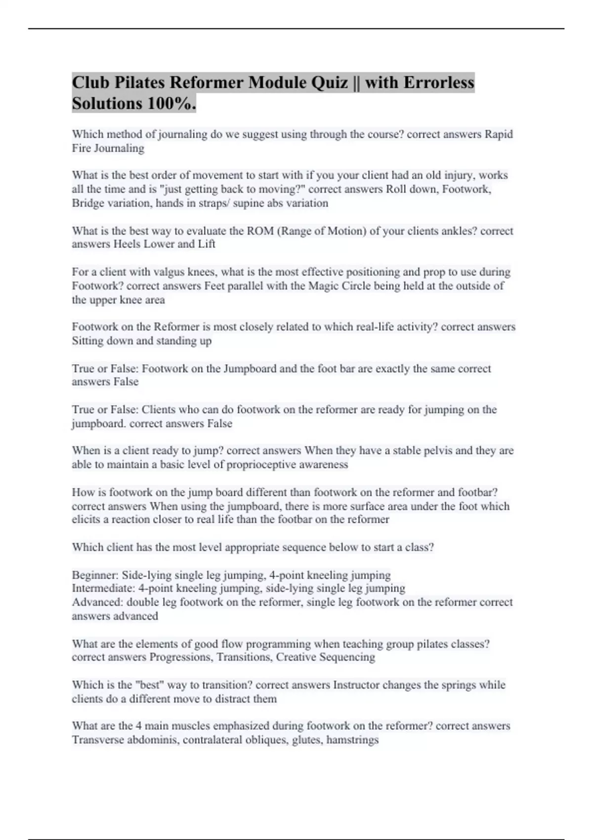 Club Pilates Reformer Module Quiz || with Errorless Solutions 100%.