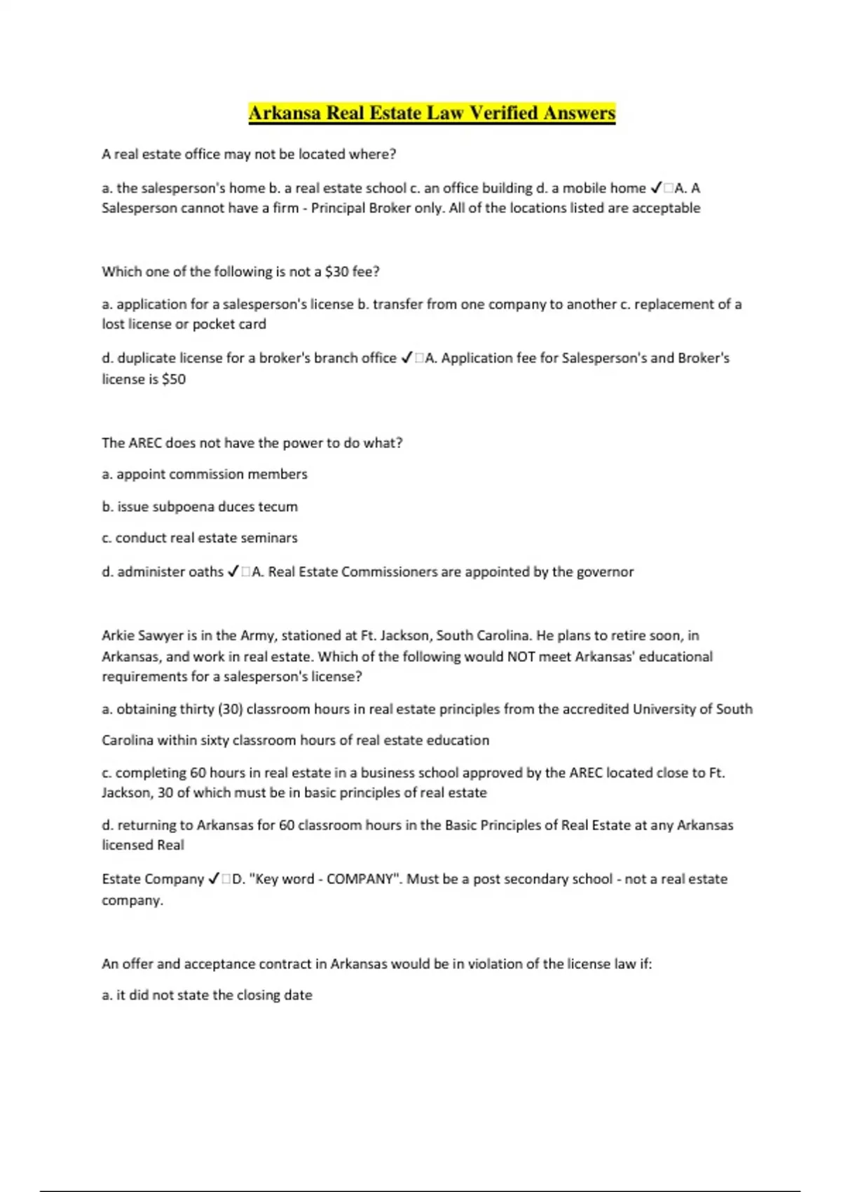 Arkansa Real Estate Law Verified Answers A real estate office may not be located where? a. the salesperson's home b. a real estate school c. an office building d. a mobile home ️A. A Salesperson cannot have a firm - Principal Broker only. All of the locations listed are acceptable Which one of the following is not a $30 fee? a. application for a salesperson's license b. transfer from one company to another c. replacement of a lost license or pocket card d. duplicate license for a broker's branch office ️A. Application fee for Salesperson's and Broker's license is $50 The AREC does not have the power to do what? a. appoint commission members b. issue subpoena duces tecum c. conduct real estate seminars d. administer oaths ️A. Real Estate Commissioners are appointed by the governor Arkie Sawyer is in the Army, stationed at Ft. Jackson, South Carolina. He plans to retire soon, in Arkansas, and work in real estate. Which of the following would NOT meet Arkansas' educational requirements for a salesperson's license? a. obtaining thirty (30) classroom hours in real estate principles from the accredited University of South Carolina within sixty classroom hours of real estate education c. completing 60 hours in real estate in a business school approved by the AREC located close to Ft. Jackson, 30 of which must be in basic principles of real estate d. returning to Arkansas for 60 classroom hours in the Basic Principles of Real Estate at any Arkansas licensed Real Estate Company ️D. "Key word - COMPANY". Must be a post secondary school - not a real estate company. An offer and acceptance contract in Arkansas would be in violation of the license law if: a. it did not state the closing date b. the parties did not receive a copy of the signed offer and acceptance c. it did not include earnest money d. if it were signed by a seventeen-year old female who had her minority rights removed ️B. Everyone who signed must receive copies of all documents Salesperson Post-Licensure (18 hrs) will need to be completed: a. Within 6 days of passing the exam b. Within 12 months after the date the individual was licensed. c. Within 6 months after the date the individual was licensed d. By Dec. 31 of the year they were licensed ️C. Must be within 6 months after the date the individual was initially licensed All real estate licenses expire yearly on what date? a. December 31 b. November 30 c. September 30 d. January 1 ️A. Dec. 31 of each year - does not matter when your license was issued. You must have a valid real estate license if for compensation, you: a. appraise property b. auction personal property c. publish real estate ads d. procure real estate prospects ️D. When you solicit real estate, you must be licensed. Payments from the Real Estate Recovery Fund may be used to pay any of the following EXCEPT: a. a monetary loss suffered by a person who sold property using a broker who had an undisclosed interest in the buyer's welfare b. a claim by a salesperson against a broker for an unpaid commission c. actual or compensatory damages to an aggrieved party d. damages not in excess of $75,000 with respect to the acts of any one licensee ️B. AREC does not have jurisdiction over commissions - must go to court. Ima Nutt, a salesperson for Ruth's Realty Company, listed Barry Small's property. Before the listing expired, Ima received her broker's license, left Ruth's Realty, and opened Nutt Realty. Which of the following statements is true? a. Ima is entitled to take Small's listing to her new company since she is now a broker b. Ima may take the listing with her, but when the property sells, she must split the commission with Ruth's Realty Company c. Ima may not take the listing to her new company, but she will be entitled to a listing commission if it is sold d. When leaving Ruth's Realty, Ima forfeited all rights to the Small listing and to any commission from its sale ️D. Listings/clients belong to the Principal Broker, not the agent. Ima just passed the real estate exam, she can now: a. List a property for sale b. Show a prospective buyer properties c. Submit signed score report and licensing fees to the AREC. d. Represent a buyer and seller as a dual agent ️C. Once score report is received signifying PASS, Ima must submit it to AREC with a Broker signature & $75. She also has the option to place her license oninactive status. The AREC has the right to do all the following EXCEPT: a. conduct or assist in conducting real estate institutes and seminars b. promulgate necessary rules and regulations c. issue Time-Share licenses d. use its power to administer oaths ️C. AREC issues real estate licenses, not timeshare licenses. An applicant for a broker's license must meet the following requirements: a. file a certificate showing successful completion of 120 classroom hours in an approved school b. file a certified copy of a college or university transcript reflecting successful completion of a college credit hour course (60 actual hours) in the basic principles of real estate c. serve as an active licensed salesperson at least two years, and show at least 60 hours of real estate basic principles obtained within the last three years d. Hold an active salesperson's license not less than 24 months within the previous 48 months, and complete 60 hours of an AREC developed Pre-Broker course within the past 36 months. ️D. No rationale needed - these are the requirements. Betty Bop purchased a Time-Share on a Monday morning, but changed her mind the following day. She
