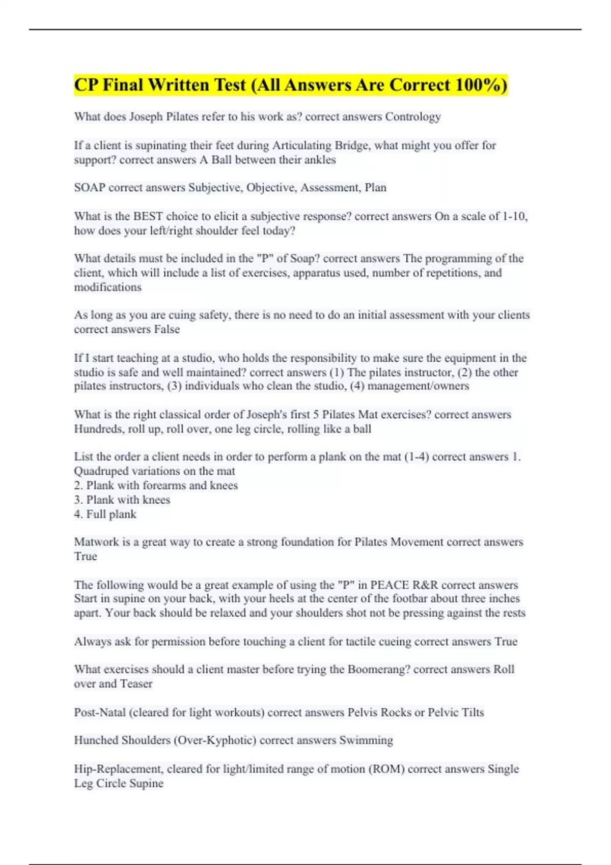 What does Joseph Pilates refer to his work as? correct answers Contrology If a client is supinating their feet during Articulating Bridge, what might you offer for support? correct answers A Ball between their ankles SOAP correct answers Subjective, Objective, Assessment, Plan What is the BEST choice to elicit a subjective response? correct answers On a scale of 1-10, how does your left/right shoulder feel today? What details must be included in the "P" of Soap? correct answers The programming of the client, which will include a list of exercises, apparatus used, number of repetitions, and modifications As long as you are cuing safety, there is no need to do an initial assessment with your clients correct answers False If I start teaching at a studio, who holds the responsibility to make sure the equipment in the studio is safe and well maintained? correct answers (1) The pilates instructor, (2) the other pilates instructors, (3) individuals who clean the studio, (4) management/owners What is the right classical order of Joseph's first 5 Pilates Mat exercises? correct answers Hundreds, roll up, roll over, one leg circle, rolling like a ball List the order a client needs in order to perform a plank on the mat (1-4) correct answers 1. Quadruped variations on the mat 2. Plank with forearms and knees 3. Plank with knees 4. Full plank Matwork is a great way to create a strong foundation for Pilates Movement correct answers True The following would be a great example of using the "P" in PEACE R&R correct answers Start in supine on your back, with your heels at the center of the footbar about three inches apart. Your back should be relaxed and your shoulders shot not be pressing against the rests Always ask for permission before touching a client for tactile cueing correct answers True What exercises should a client master before trying the Boomerang? correct answers Roll over and Teaser Post-Natal (cleared for light workouts) correct answers Pelvis Rocks or Pelvic Tilts Hunched Shoulders (Over-Kyphotic) correct answers Swimming Hip-Replacement, cleared for light/limited range of motion (ROM) correct answers Single Leg Circle Supine