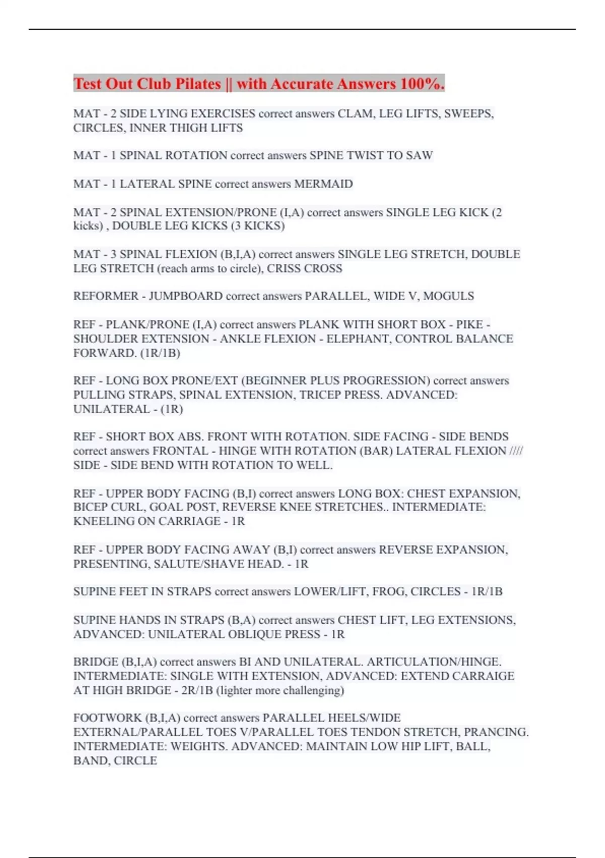 Test Out Club Pilates || with Accurate Answers 100%.