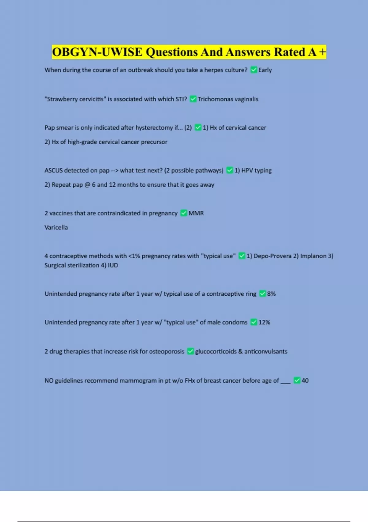 OBGYN-UWISE Questions And Answers Rated A + OBGYN-UWISE Questions And Answers Rated A +