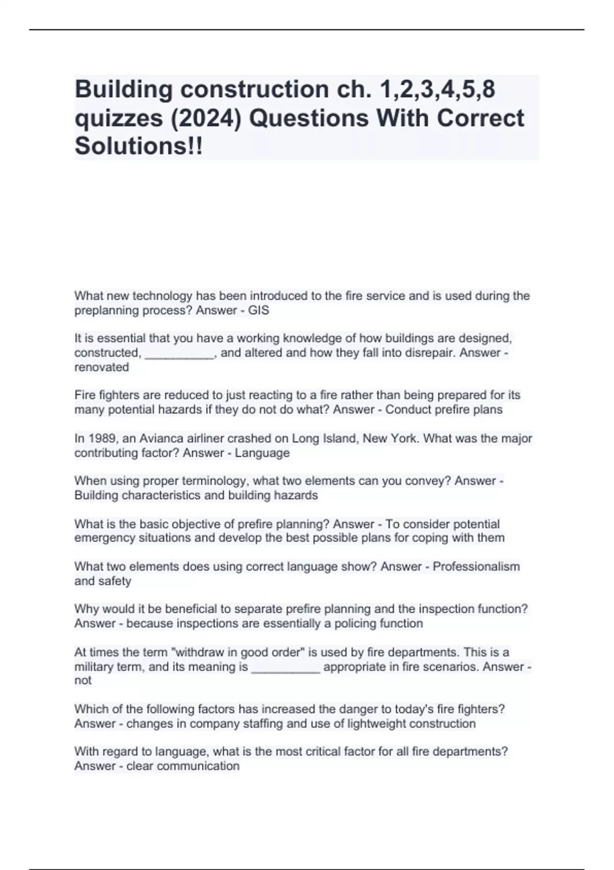 Building construction ch. 1,2,3,4,5,8 quizzes (2024) Questions With Correct Solutions!!