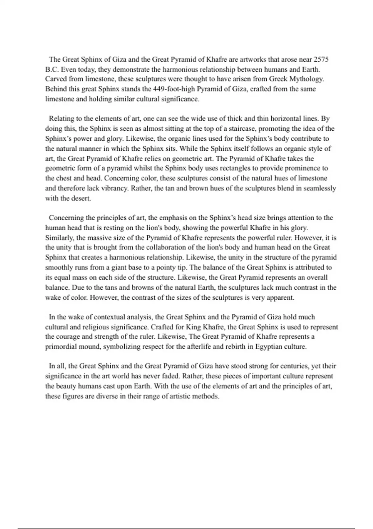 Art Appreciation, ARTS 1301, analysis essay for "The Great Sphinx" and the "Great Pyramid of Khafre" essay for Lone Star College.
