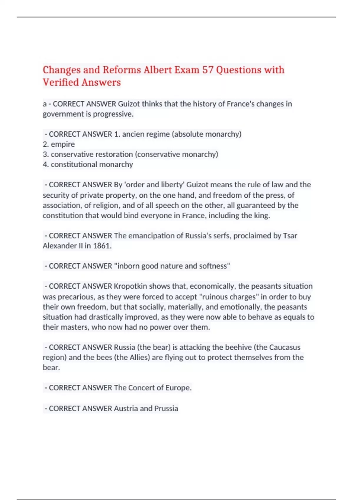 Changes and Reforms Albert Exam 57 Questions with Verified Answers a - CORRECT ANSWER Guizot thinks that the history of France's changes in government is progressive. - CORRECT ANSWER 1. ancien regime (absolute monarchy) 2. empire 3. conservative restoration (conservative monarchy) 4. constitutional monarchy - CORRECT ANSWER By 'order and liberty' Guizot means the rule of law and the security of private property, on the one hand, and freedom of the press, of association, of religion, and of all speech on the other, all guaranteed by the constitution that would bind everyone in France, including the king. - CORRECT ANSWER The emancipation of Russia's serfs, proclaimed by Tsar Alexander II in 1861. - CORRECT ANSWER "inborn good nature and softness" - CORRECT ANSWER Kropotkin shows that, economically, the peasants situation was precarious, as they were forced to accept "ruinous charges" in order to buy their own freedom, but that socially, materially, and emotionally, the peasants situation had drastically improved, as they were now able to behave as equals to their masters, who now had no power over them. - CORRECT ANSWER Russia (the bear) is attacking the beehive (the Caucasus region) and the bees (the Allies) are flying out to protect themselves from the bear. - CORRECT ANSWER The Concert of Europe. - CORRECT ANSWER Austria and Prussia - CORRECT ANSWER "impatience against that which existed" - CORRECT ANSWER their methods were very different even though middle-class revolutionaries and peasants had similar political and social goals in - CORRECT ANSWER Lamartine describes the bourgeoisie- the middle class- and the working class. According to him, the bourgeoisie are likely to be university students, businessmen, journalists, and army officers, while the working classes worked in factories with their hands. - CORRECT ANSWER His family name. - CORRECT ANSWER an alliance of Catholics and monarchists - CORRECT ANSWER He overthrew his own republican government and proclaimed himself emperor of France. - CORRECT ANSWER Traffic, pollution, slum housing, inequality, selfishness, anonymity. - CORRECT ANSWER The Industrial Revolution. - CORRECT ANSWER Workers would rotate through a number of different jobs each day. - CORRECT ANSWER Fourier's vision of the Phalanxes can be termed as 'utopian socialism' because it combined a utopian vision of a completely harmonious and peaceful society with a socialist emphasis on equality: all would work freely, without heirarchy, for the good of the community. - CORRECT ANSWER Engels argues that industrial capitalism has produced a class of people who are poverty-stricken, living deeply unstable lives in squalor. Engels supports his arguments by describing the conditions of the workers in vivid and hyperbolic terms, highlighting how they are dressed in rags, close to starvation, and living in filthy, tumbledown housing. - CORRECT ANSWER Engels argues that the social relations of the inhabitants of large cities are poor because the sheer mass of people and the inequality that stratifies them makes it impossible to build meaningful relationships. Mass urbanization is a problem not only because of these poor social relations, but also because of the squalid living conditions of the poorest inhabitants. - CORRECT ANSWER London's size reduces everyone to selfish anonymity. The noise, crowds, pollution, poverty, and inequality are all so shocking that there is something "repulsive" about them. - CORRECT ANSWER The Industrial Revolution - CORRECT ANSWER Russia's Bolshevik revolution led by Vladimir Ilyich Lenin and the Russian Communist Party in 1917-18 - CORRECT ANSWER Utopian socialism - CORRECT ANSWER Industrialism - CORRECT ANSWER By "right to a minimum", Charles Fourier is articulating the statement that everyone has the right to sufficient food, clothing, shelter, and fuel to ensure that he does not parish from the lack of those very basic goods. - CORRECT ANSWER Oastler portrays the mill workers as stuck in miserable poverty, so poor that they cannot afford to eat properly, their employers have complete power over them. Oastler is very sympathetic to them because they are victims of a terrible system. - CORRECT ANSWER To protest the bad pay and poverty of the workforce - CORRECT ANSWER Oastler is referring to the working class, middle class, and the industrial capitalist class. - CORRECT ANSWER Jean-Jacques Rousseau - CORRECT ANSWER Liberalism holds that all people are responsible for their own behavior and the state should trust them to act in their own best interests. Smiles' argument is liberal because he argues that the working class will not be able to improve their situation until they take responsibility for their own behavior and try to improve themselves. - CORRECT ANSWER Trade unionists - CORRECT ANSWER Negative - CORRECT ANSWER The assassination of Czar Alexander II - CORRECT ANSWER Stanford argues that women now command respect thanks to their individual qualities. It is therefore in everyone's best interests to treat women well because that improves home life, and thus society at large. - CORRECT ANSWER The enforcement of traditional gender norms, which moved most to create stricter separate spheres for the sexes. - CORRECT ANSWER An unstable increase in population and mass starvation. - CORRECT ANSWER The check on early marriages is the inability to support a family, driven by and absolute lack of food, or the anticipation of a food shortage. - CORRECT ANSWER How high a population can grow is constrained by the amount of food that can be produced to sustain it. No human population has avoided the 'check' of not having enough food or fearing not having enough food. - CORRECT ANSWER Mann is discussing Britain's position as the leading exporter of cotton textile goods, for which it dominated the global market so completely that almost everywhere was forced to purchase them. Mann sees Britain's industrial development as a process of increasing global p
