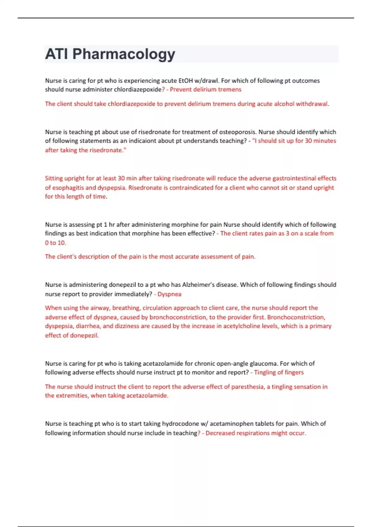 ATI Pharmacology Nurse is caring for pt who is experiencing acute EtOH w/drawl. For which of following pt outcomes should nurse administer chlordiazepoxide? - Prevent delirium tremens The client should take chlordiazepoxide to prevent delirium tremens during acute alcohol withdrawal. Nurse is teaching pt about use of risedronate for treatment of osteoporosis. Nurse should identify which of following statements as an indicaiont about pt understands teaching? - "I should sit up for 30 minutes after taking the risedronate." Sitting upright for at least 30 min after taking risedronate will reduce the adverse gastrointestinal effects of esophagitis and dyspepsia. Risedronate is contraindicated for a client who cannot sit or stand upright for this length of time. Nurse is assessing pt 1 hr after administering morphine for pain Nurse should identify which of following findings as best indication that morphine has been effective? - The client rates pain as 3 on a scale from 0 to 10. The client's description of the pain is the most accurate assessment of pain. Nurse is administering donepezil to a pt who has Alzheimer's disease. Which of following findings should nurse report to provider immediately? - Dyspnea When using the airway, breathing, circulation approach to client care, the nurse should report the adverse effect of dyspnea, caused by bronchoconstriction, to the provider first. Bronchoconstriction, dyspepsia, diarrhea, and dizziness are caused by the increase in acetylcholine levels, which is a primary effect of donepezil. Nurse is caring for pt who is taking acetazolamide for chronic open-angle glaucoma. For which of following adverse effects should nurse instruct pt to monitor and report? - Tingling of fingers The nurse should instruct the client to report the adverse effect of paresthesia, a tingling sensation in the extremities, when taking acetazolamide. Nurse is teaching pt who is to start taking hydrocodone w/ acetaminophen tablets for pain. Which of following information should nurse include in teaching? - Decreased respirations might occur.The nurse should instruct the client that hydrocodone with acetaminophen might cause respiratory depression, which is an adverse effect of the medication. The client should avoid taking over-thecounter medications or newly prescribed medications without consulting their provider to avoid increased respiratory depression. Nurse is providing teaching to pt who has gastric ulcer and new prescription for ranitidine. Which of following instructions should nurse include? - "Report yellowing of the skin." Ranitidine can be hepatotoxic and cause jaundice. The nurse should instruct the client to monitor for and report yellowing of the skin or eyes to the provider. Nurse is preparing to administer ciprofloxacin 15 mg/kg PO q12h to child weighs 44 lb. How many mg should nurse administer per dose? - 300 mg Nurse administers metformin to pt instead of prescribed dose of metoclopramide. Which of following actions should nurse take 1st? - Check the client's blood glucose.
