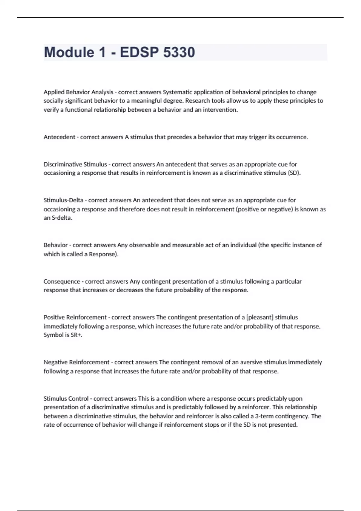 Module 1 - EDSP 5330 Question and answers rated A+ 2024 Applied Behavior Analysis - correct answers Systematic application of behavioral principles to change socially significant behavior to a meaningful degree. Research tools allow us to apply these principles to verify a functional relationship between a behavior and an intervention. Antecedent - correct answers A stimulus that precedes a behavior that may trigger its occurrence. Discriminative Stimulus - correct answers An antecedent that serves as an appropriate cue for occasioning a response that results in reinforcement is known as a discriminative stimulus (SD). Stimulus-Delta - correct answers An antecedent that does not serve as an appropriate cue for occasioning a response and therefore does not result in reinforcement (positive or negative) is known as an S-delta. Behavior - correct answers Any observable and measurable act of an individual (the specific instance of which is called a Response). Consequence - correct answers Any contingent presentation of a stimulus following a particular response that increases or decreases the future probability of the response. Positive Reinforcement - correct answers The contingent presentation of a [pleasant] stimulus immediately following a response, which increases the future rate and/or probability of that response. Symbol is SR+. Negative Reinf