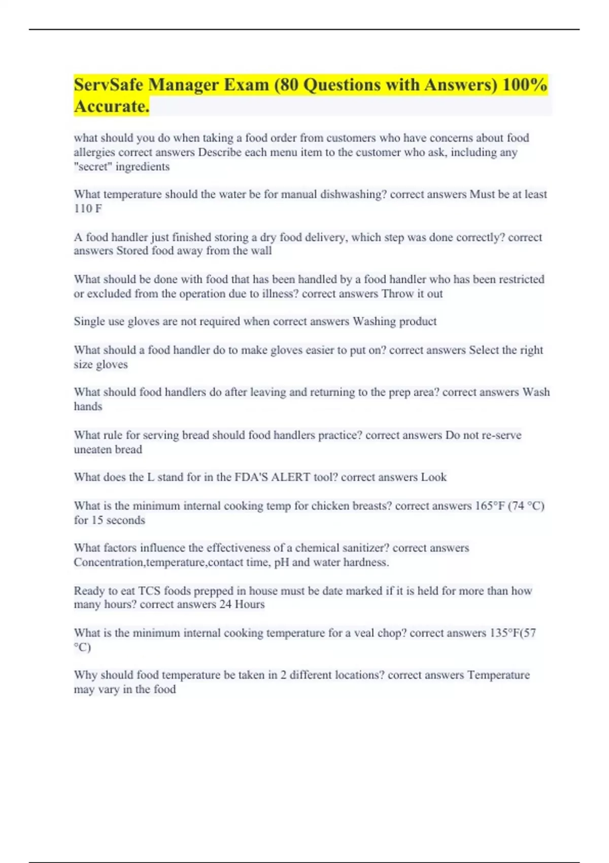ServSafe Manager Exam (80 Questions with Answers) 100% Accurate.